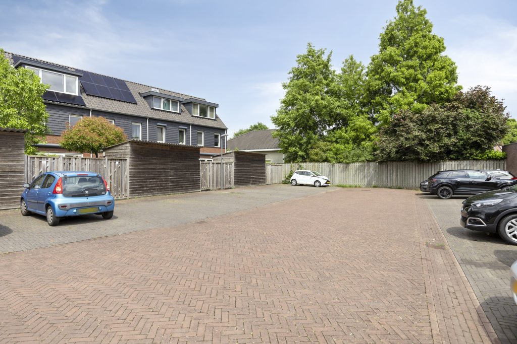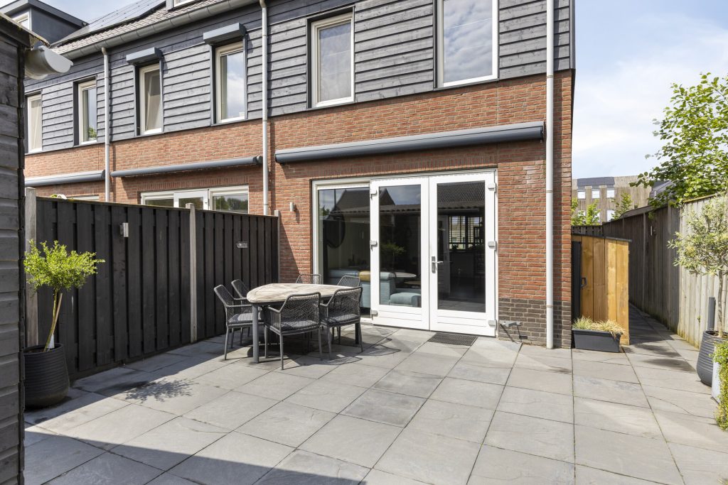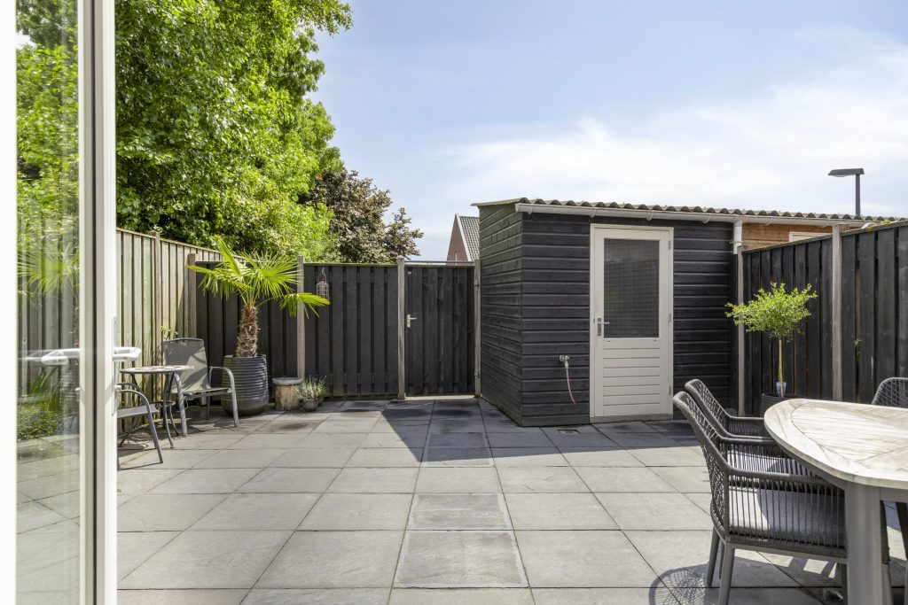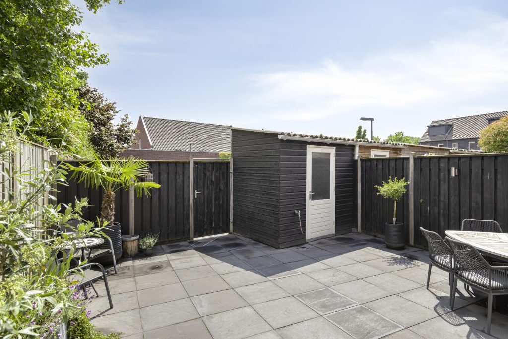 De volledig omheinde achtertuin is bestraat en heeft een achterom aan de achterzijde, maar ook nog een 2e achterom naast de woning, naar de voortuin. De tuin is op de zonzijde gelegen en heeft een elektrisch bedienbare zonneluifel. De houten berging biedt opslagruimte. Het achtergelegen terrein biedt volop ruimte voor het parkeren van een auto.