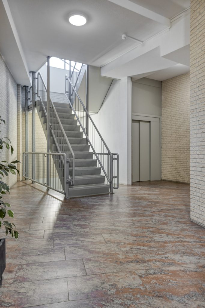 De galerij op de 2e verdieping is zowel via het trappenhuis als per lift bereikbaar. Aan de galerij is het appartement gelegen en tevens bevindt zich hier de meterkast.
