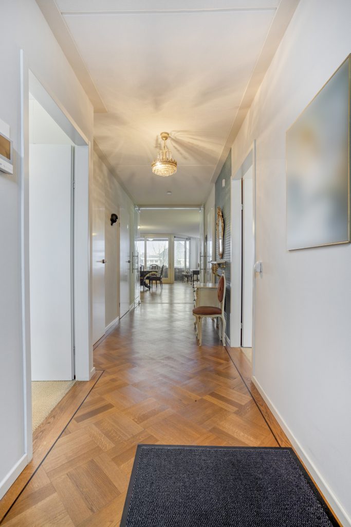 Direct bij binnenkomst in het appartement valt de ruimte op. Aan de ruime hal zijn 2 slaapkamers, de badkamer, toiletruimte en berging gelegen. Dubbele glazen deuren geven toegang tot de woonkamer. In de hal bevindt zich de videofooninstallatie.