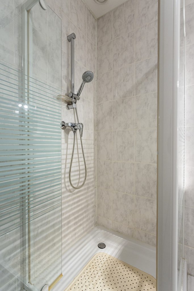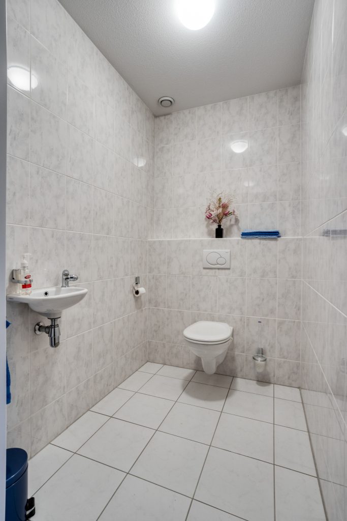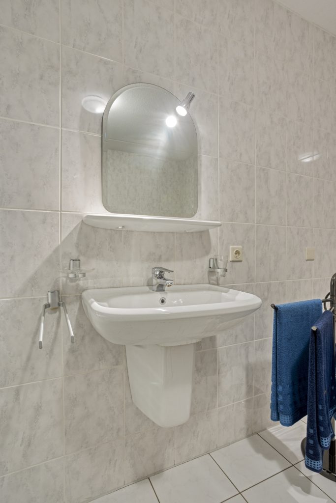 De separate toiletruimte is ruim van afmeting, volledig betegeld en voorzien van een hangend toilet en fonteintje. De volledig betegelde badkamer is ook ruim van afmeting en is voorzien van een douchecabine met thermostaatkraan, ligbad met handdouche, hangend toilet en een wastafel.