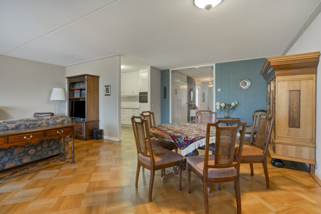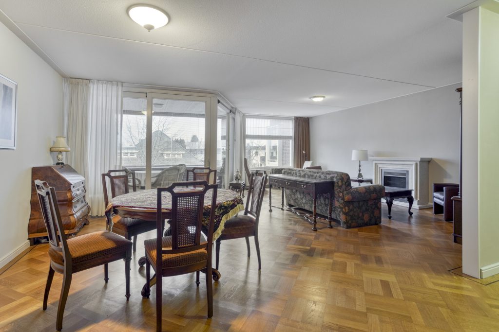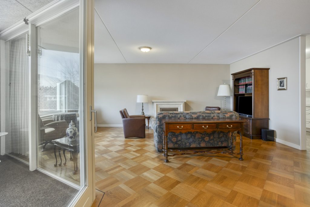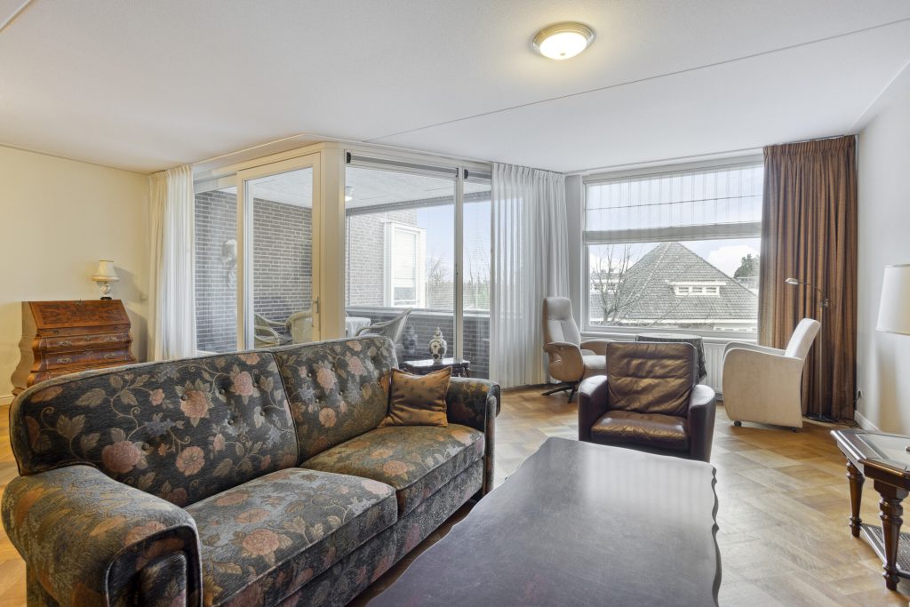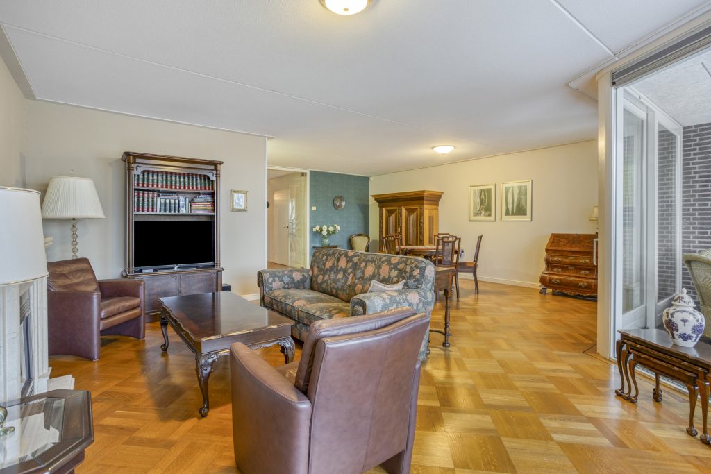 De royale woonkamer van maar liefst 46 m² is evenals de hal voorzien van een parketvloer in diagonaal blokmotief. De wanden zijn voorzien van stucwerk en het plafond is afgewerkt met spuitwerk. Aan de woonkamer is het overdekte balkon gelegen, dat middels glazen schermen kan worden afgesloten. Vanaf dit balkon is er zicht op het centrum van Best.