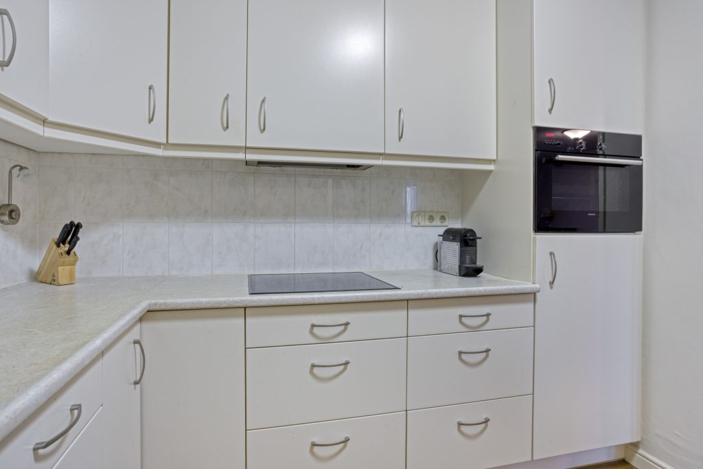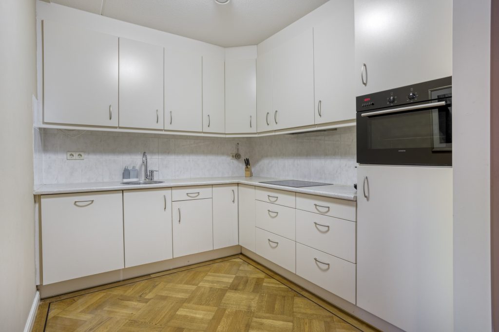 De open keuken heeft een keukenuitrusting in hoekopstelling, bestaande uit volop onder- en bovenkastjes, lades, een keramische kookplaat, afzuigkap, combi-oven, spoelbak, vaatwasser en koelkast.