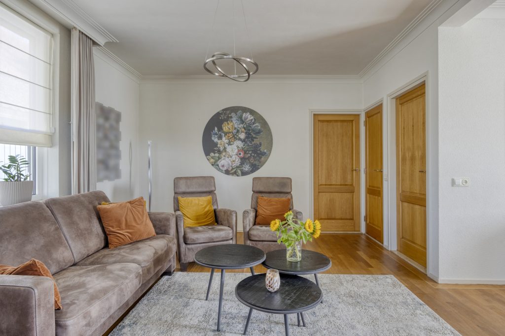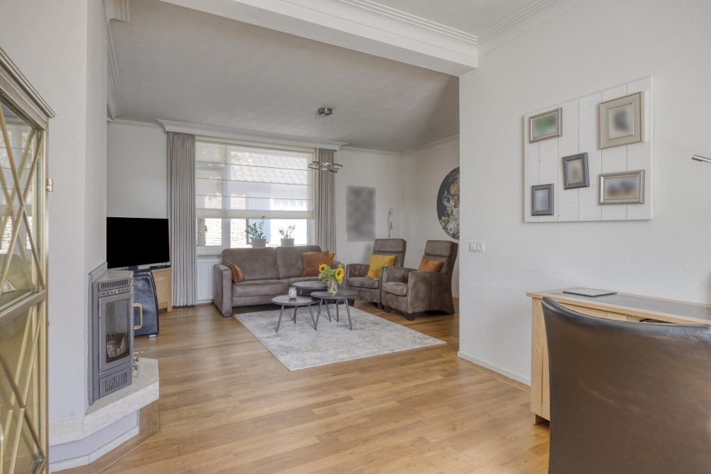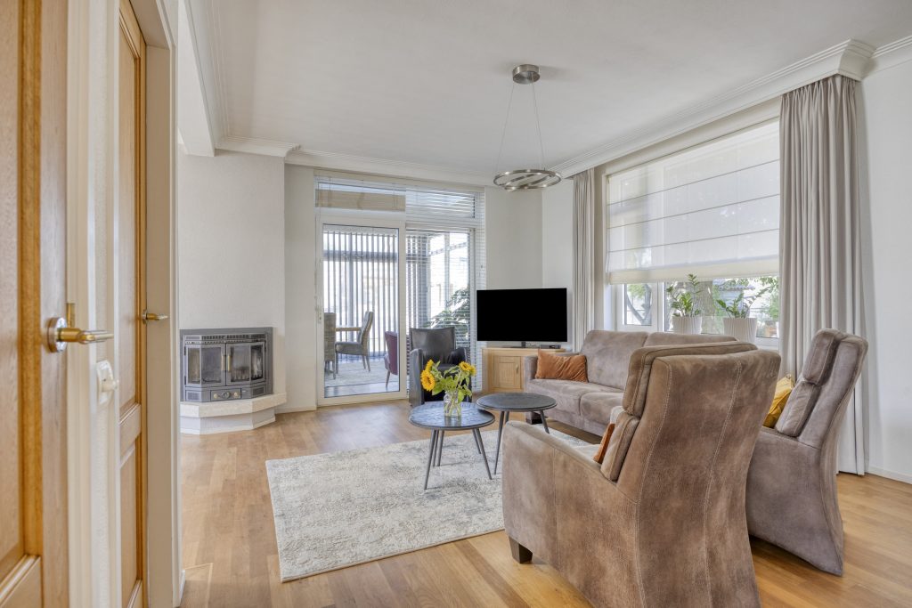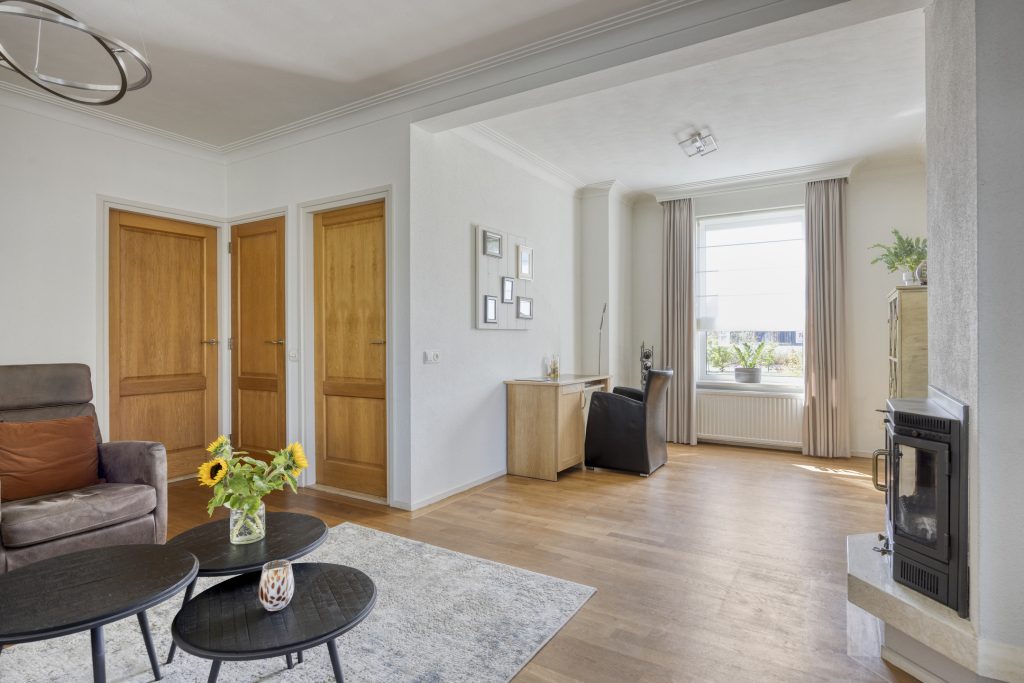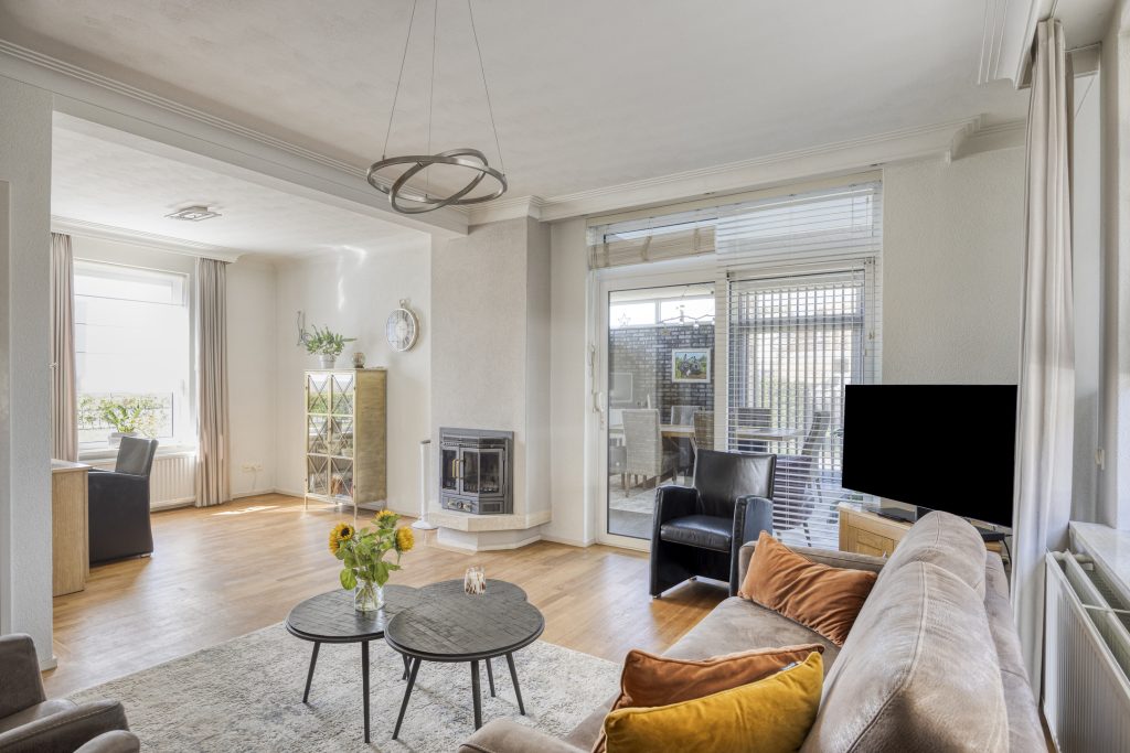 De woonkamer is gelegen aan de linkerzijde van de woning en is erg ruim en licht te noemen. De natuurlijke lichtinval wordt verkregen door middel van de raampartijen aan de voor- en achterzijde van de woning. De woonkamer is gemakkelijk in te delen als zitgedeelte en eetgedeelte. Een schouw met hierin een houtkachel zorgt voor extra warmte en sfeer tijdens de koude winterdagen. Vanuit de woonkamer is een praktische trapkast te bereiken.