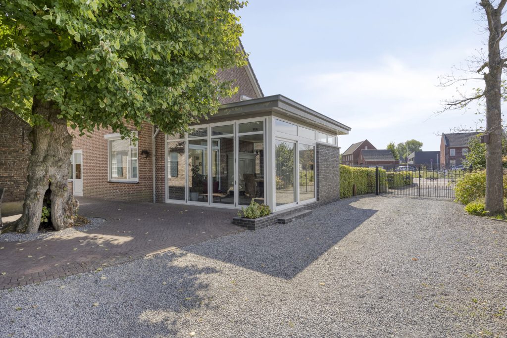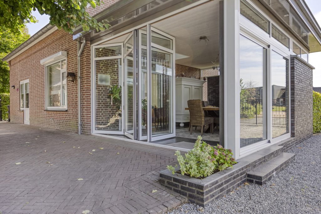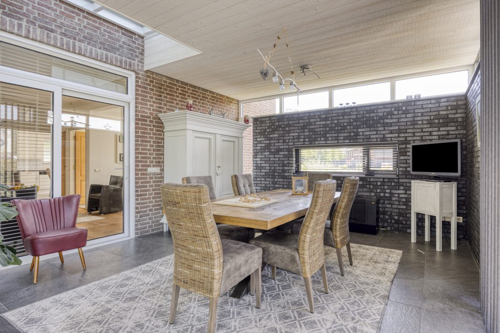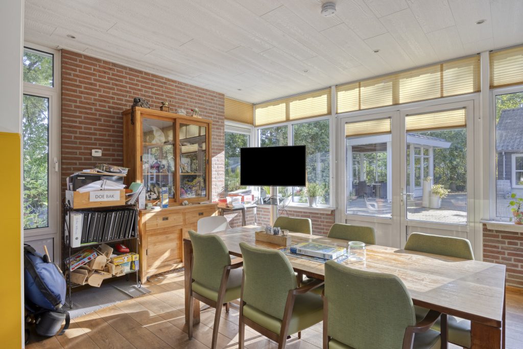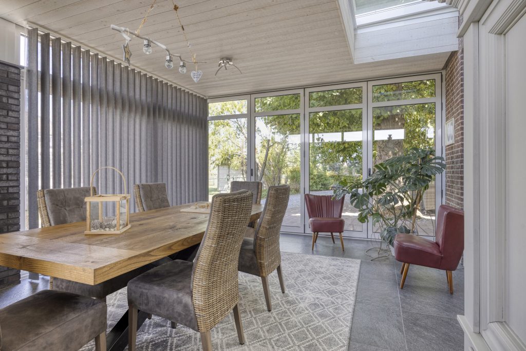 Via een schuifpui is de gezellige tuinkamer te bereiken. Natuurlijke lichtinval wordt hier verkregen door middel van de grote raampartijen en de tuindeuren die over de volledige breedte open kunnen. Tevens is er een ruime lichtstraat aanwezig voor de natuurlijke lichtinval. Vanuit de tuinkamer heeft u een fraai uitzicht over de groene achtertuin.