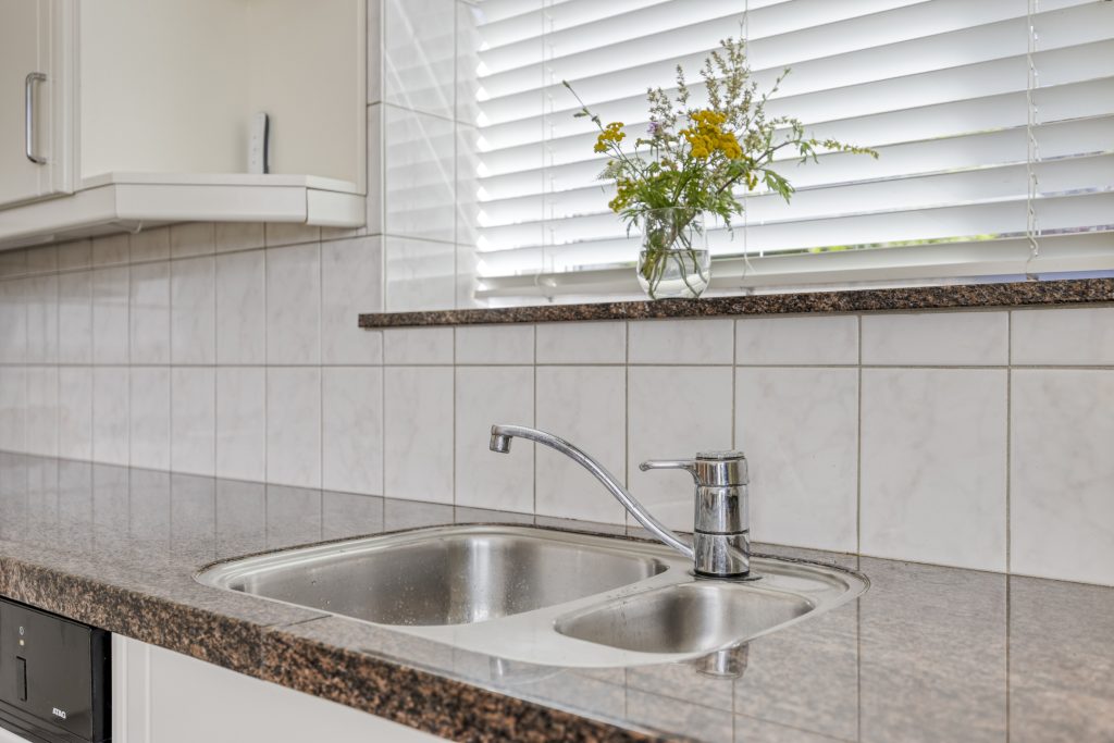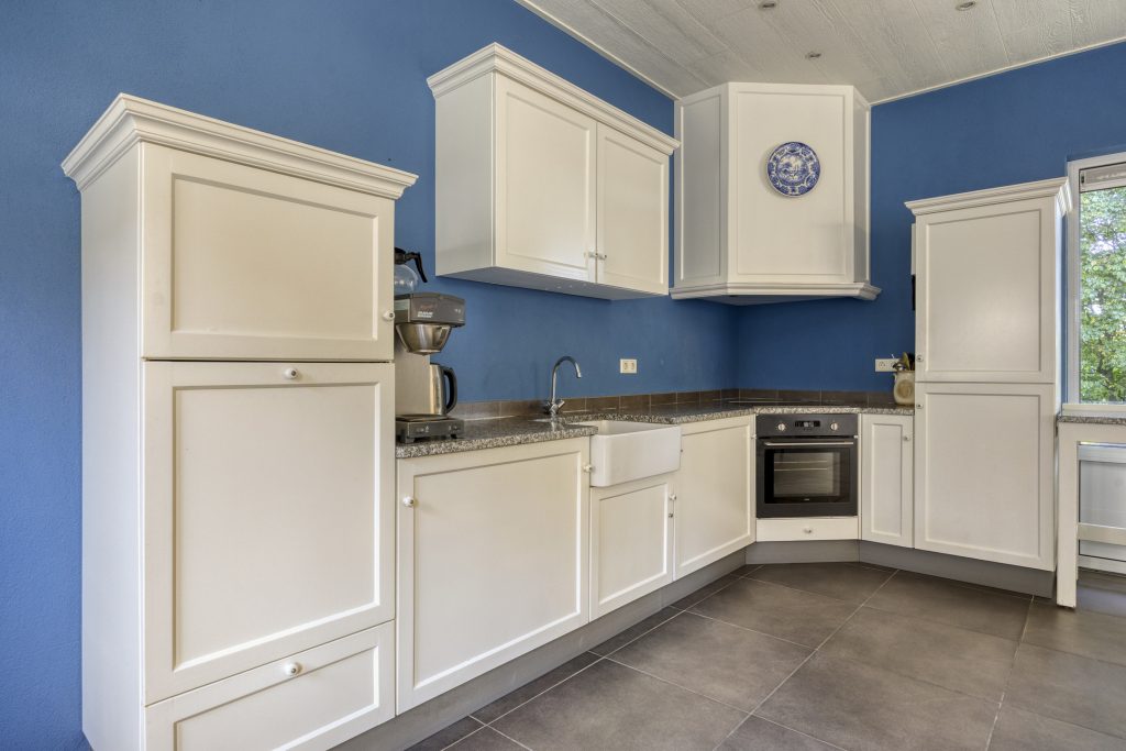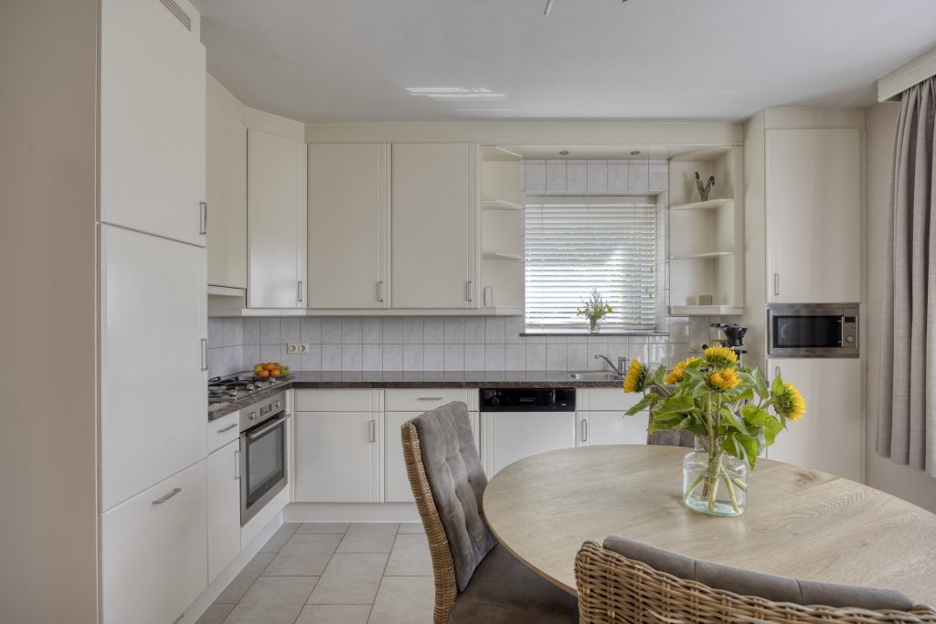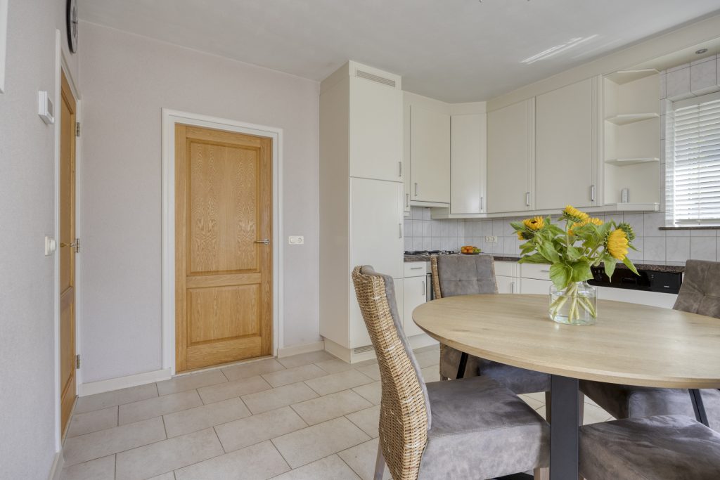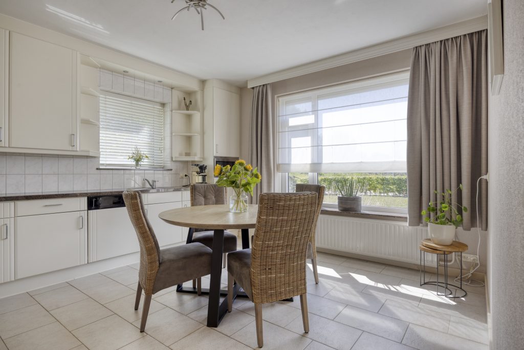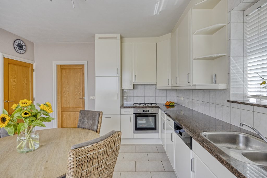 De woonkeuken is gelegen aan de rechterzijde van de woning en de keuken is geplaatst in een hoekopstelling met een natuurstenen aanrechtblad. De inbouwapparatuur bestaat uit onder andere een gaskookplaat, een afzuigkap, een bakoven, een magnetron, een koelkast en een vaatwasser. Via een raam heeft u een vrij uitzicht over de straat en kunt u tot zeker “De Poort van Best” uitkijken.