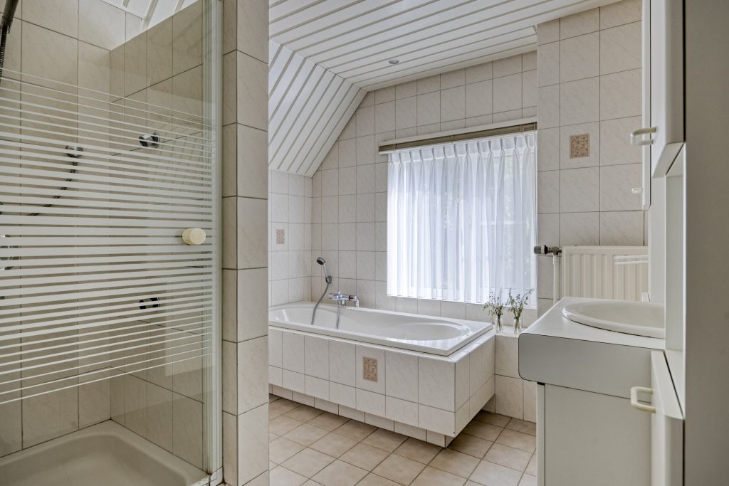 Op de eerste verdieping zijn via de overloop drie ruime slaapkamers, een badkamer en een berging/praktische kast te bereiken. Twee slaapkamers zijn aan de voorzijde van de woning gelegen en één slaapkamer is aan de achterzijde van de woning gelegen. De slaapkamer aan de achterzijde heeft de beschikking over een praktische vaste kast. De berging/praktische kast is bij uitstek te gebruiken als garderobe ruimte. De badkamer is ingericht met een ligbad, een douche, een toilet en een wastafel in een meubel. Via een raam wordt er natuurlijke lichtinval en natuurlijke ventilatie verkregen.