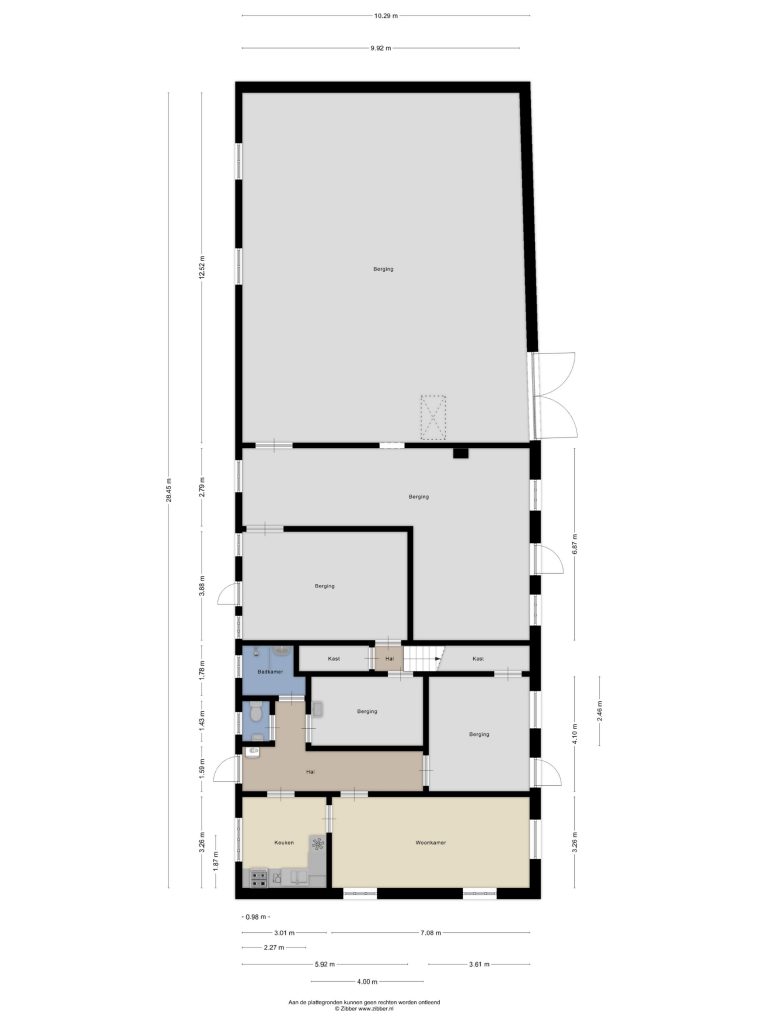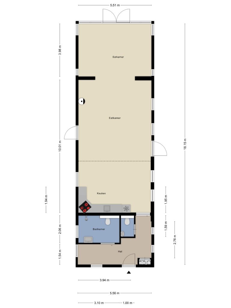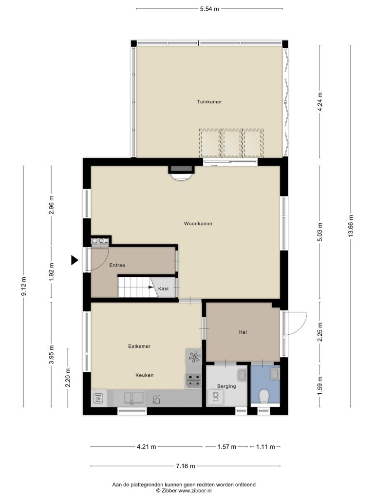 Via de entree/hal is de accommodatie ten behoeve van dagopvang te betreden. Hier bevinden zich de garderobe en de meterkast. Vanuit hier zijn een separate toiletruimte (mechanische ventilatie) en een badkamer te bereiken. De badkamer is ingericht met een douche, een toilet en een vaste wastafel. Een raam zorgt hier voor natuurlijke lichtinval en er is mechaniche ventilatie aanwezig. Vanuit de hal is de grote open ruimte te betreden. In deze ruimte is een keuken aanwezig, welke is geplaatst in een hoekopstelling. Als inbouwapparatuur bevindt zich hier een inductiekookplaat, een afzuigkap, een vaatwasser, twee koelkasten en een diepvriezer. Via diverse tuindeuren is de omliggende tuin te bereiken en midden in de algemene ruimte bevindt zich een rookkanaal met gaskachel.