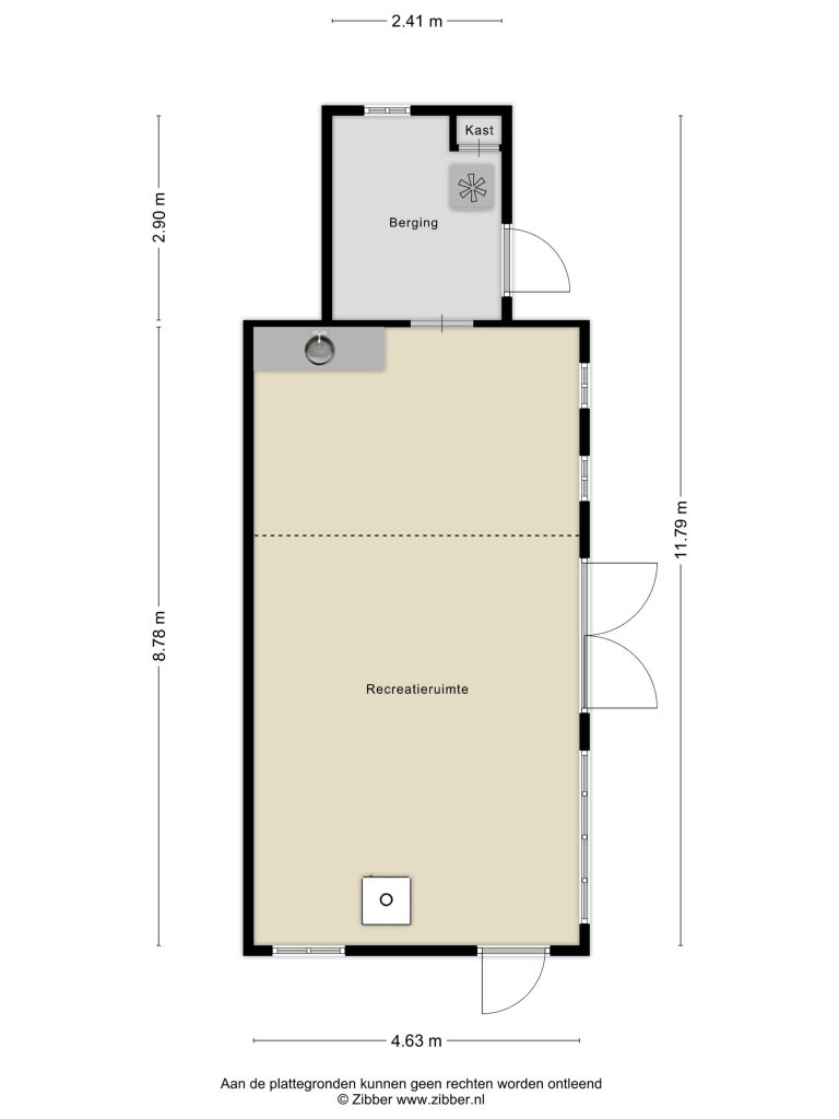 De recreatieruimte is gebouwd in 2008 en is opgetrokken uit steen en gedeeltelijk met hout gepotdekseld. Het dak is met pannen gedekt. De kozijnen zijn uitgevoerd in hout met veiligheidsglas. Via tuindeuren is deze recreatieruimte te bereiken. In deze ruimte is een tegelvloer aanwezig en een rookkanaal met gaskachel. Deze recreatieruimte is aangesloten op elektra.
