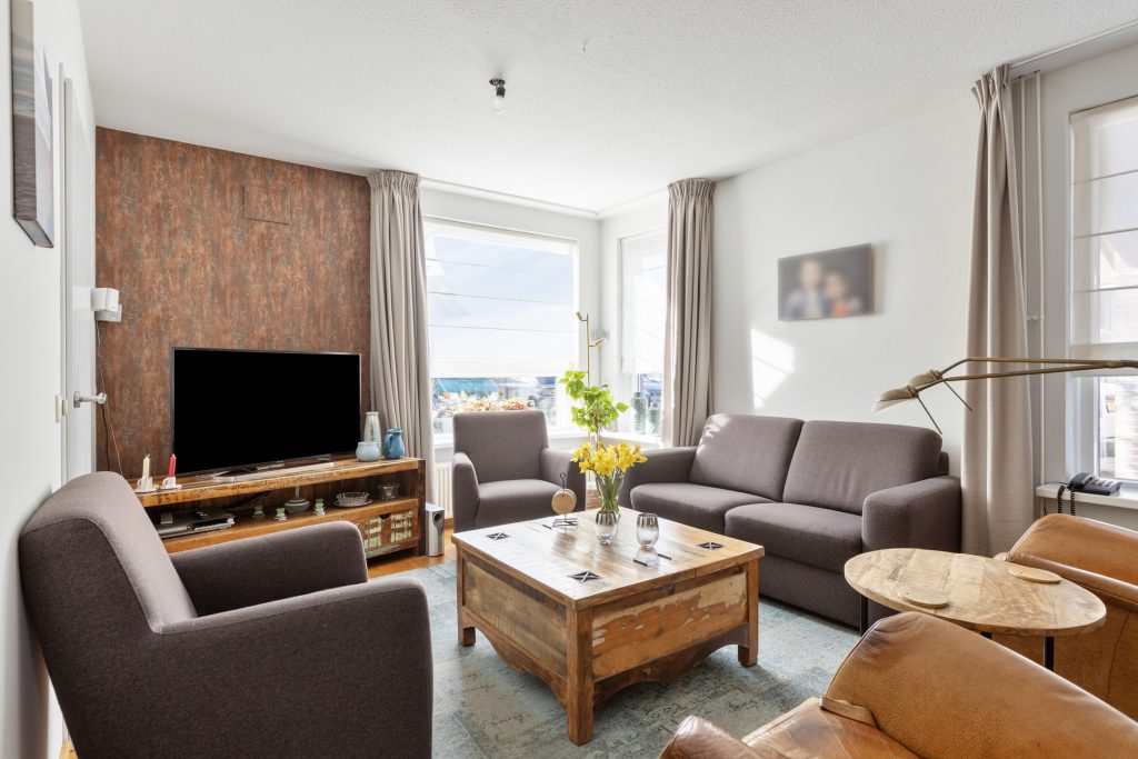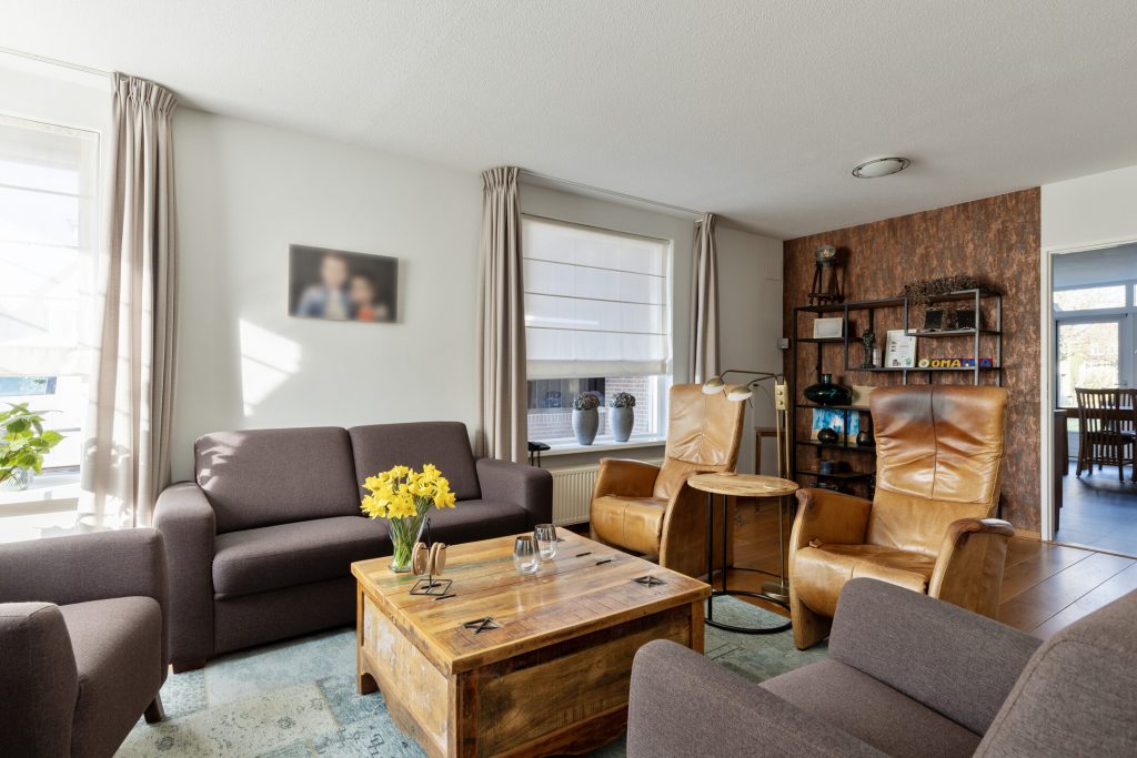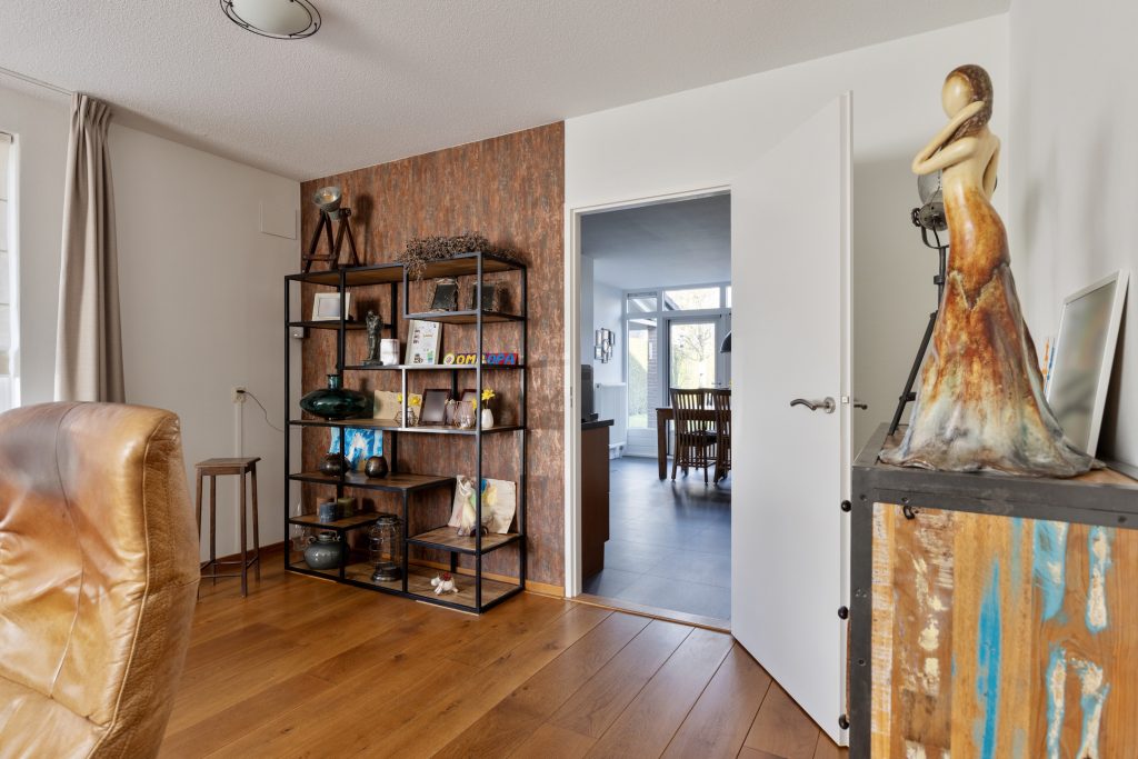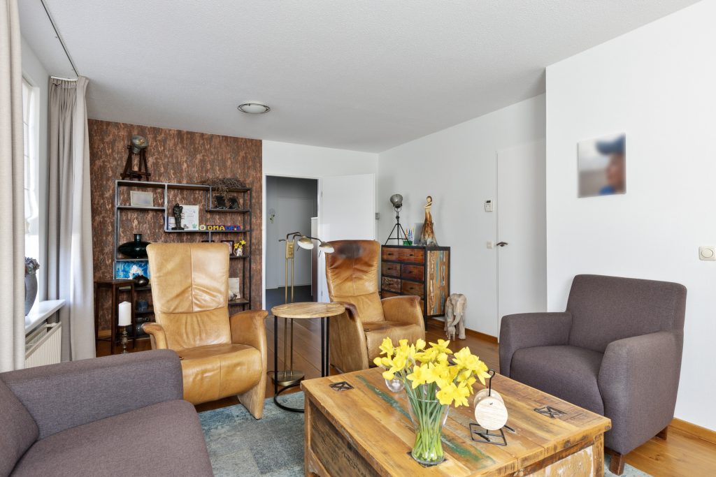 Via de overdekte entree komt u binnen in de hal, waar zich de meterkast en de toiletruimte bevinden. Vanuit de hal loopt u door naar de woonkamer. De massief eiken vloer geeft de ruimte een warme uitstraling en dankzij de grote raampartijen valt er aangenaam veel daglicht naar binnen. De woonkamer staat in open verbinding met de leefkeuken, waardoor er een ruim en functioneel geheel ontstaat.