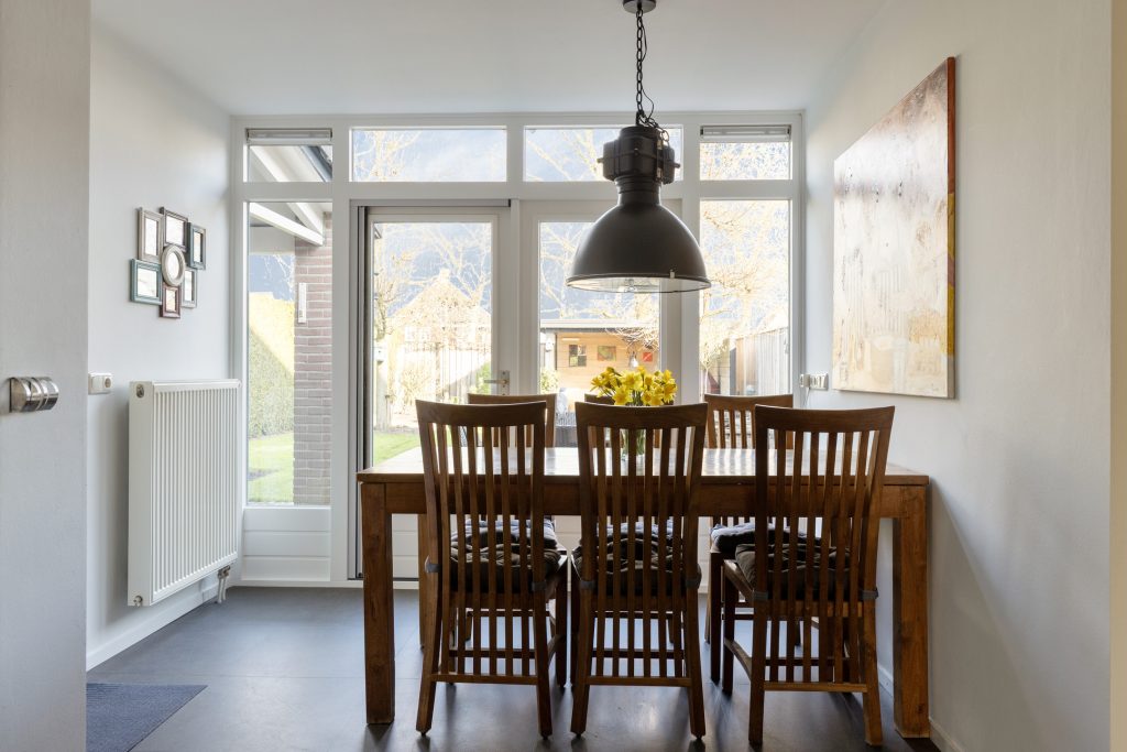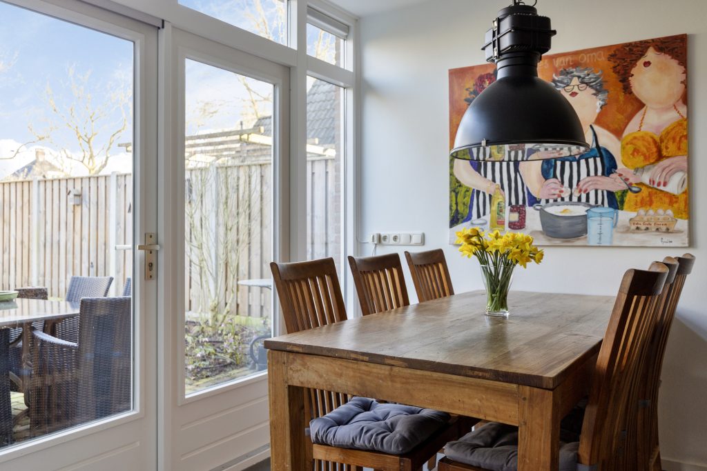 Via de openslaande deuren is de tuin direct bereikbaar, wat zorgt voor een prettige verbinding tussen binnen en buiten.