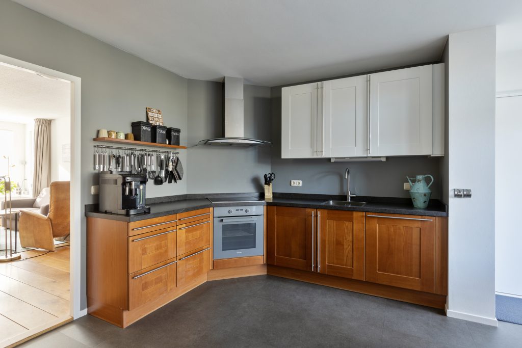 De keukenopstelling is praktisch ingericht in een hoek en voorzien van een inductiekookplaat, oven en vaatwasser. Het