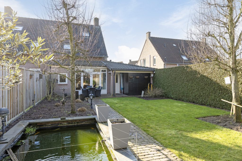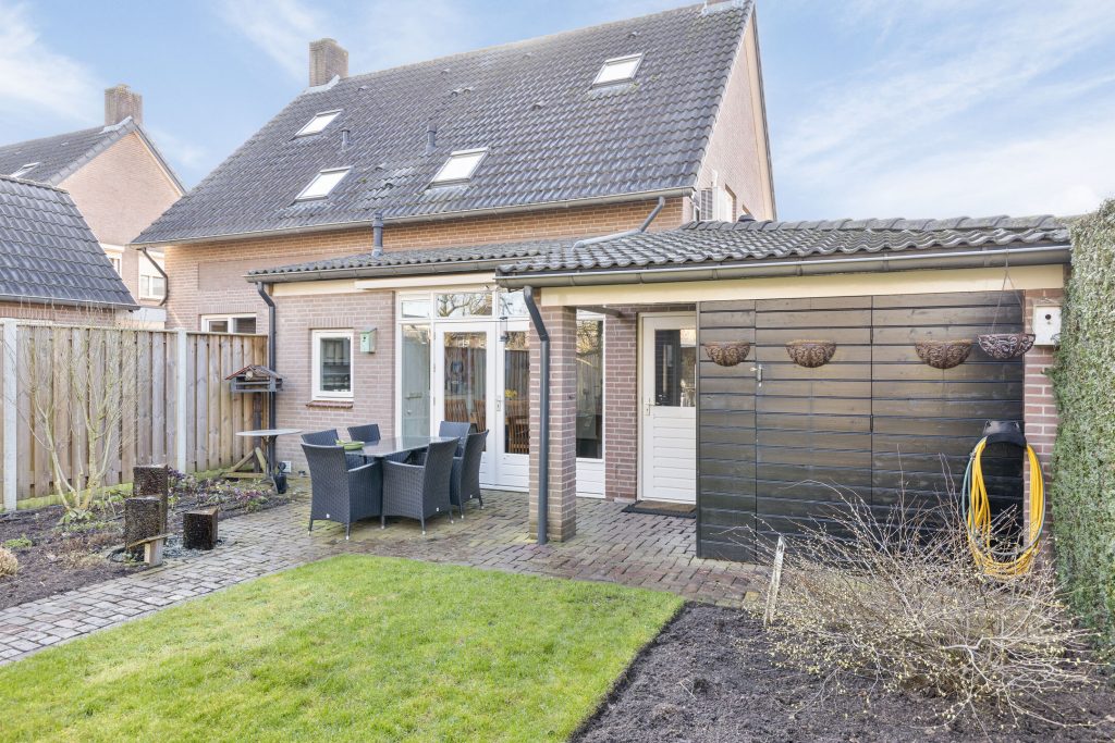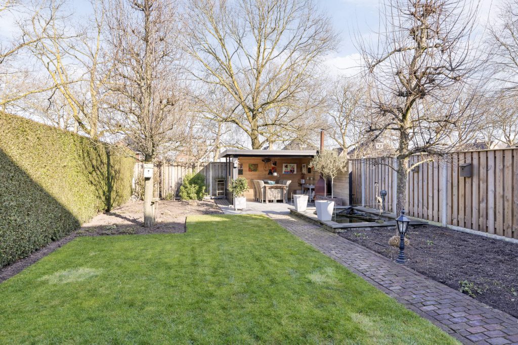 – Ruime achtertuin op het noorden met overkapping, berging en achterom.