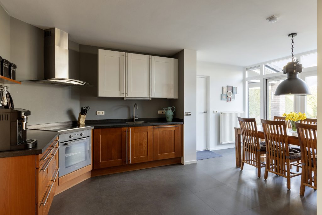 De keuken is in 2004 uitgebouwd en biedt daardoor volop ruimte voor een grote eettafel.