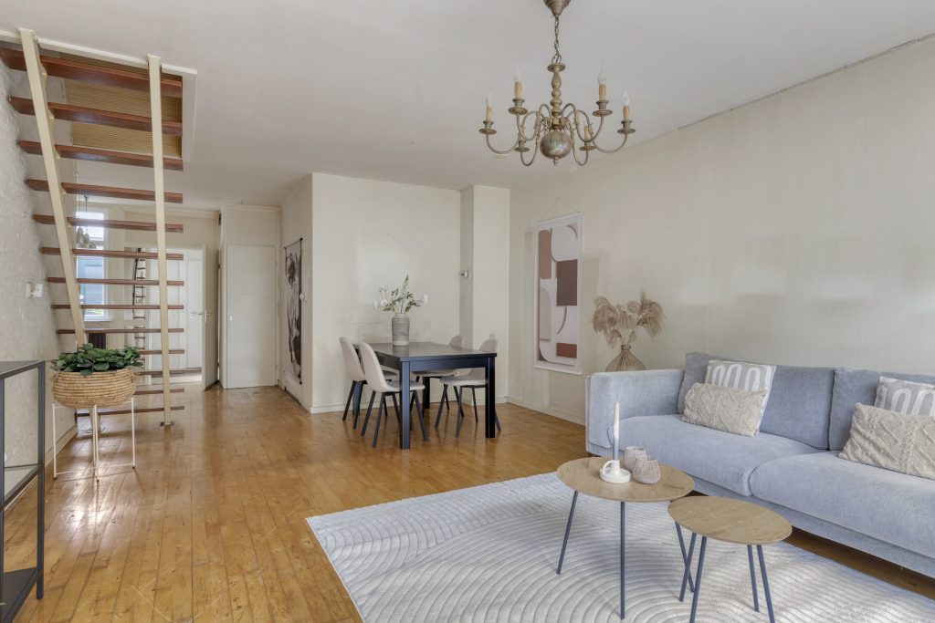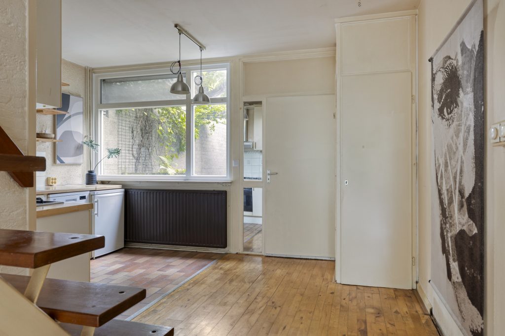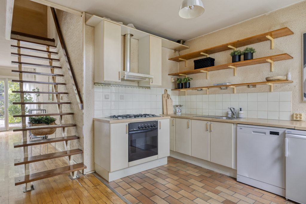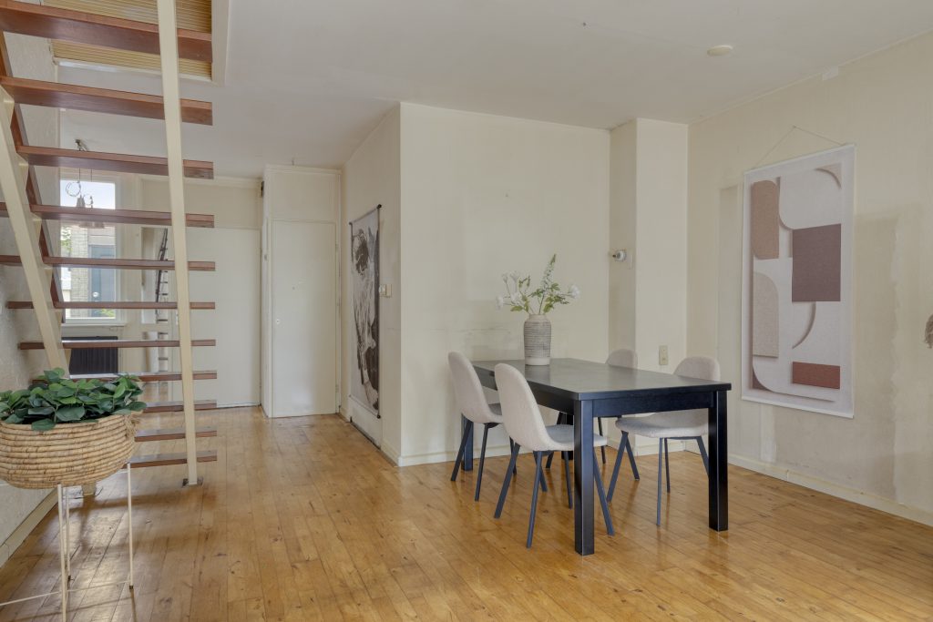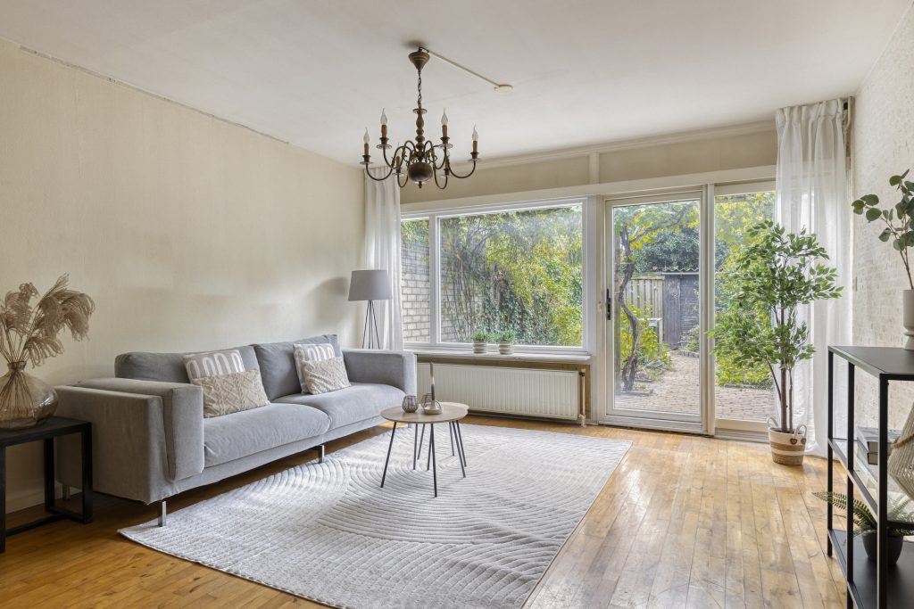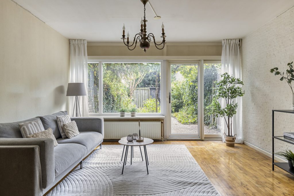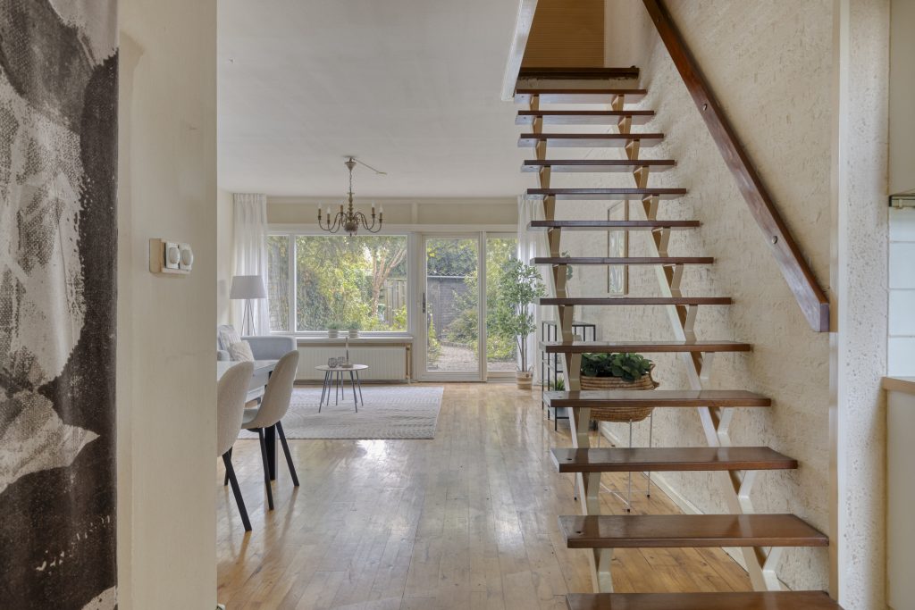 De woonkamer is verrassend licht dankzij de schuifpui naar de tuin. Vanaf de bank heeft u een vrij uitzicht over de groene achtertuin. Centraal in de gezellige woonkamer bevindt zich de trap naar eerste verdieping.