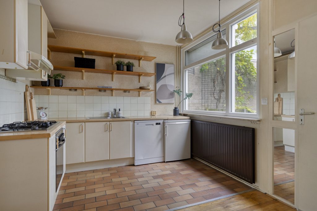 Vanuit de hal bereikt u de open keuken welke in hoekopstelling is geplaatst. De keuken is voorzien diverse inbouwapparatuur, onder andere een gaskookplaat, een afzuigkap en een oven. Vanuit de keuken kijkt u uit over uw voortuin en het pad naar de straat Heerkensveld. Een handige kast met de opstelling van de cv-combiketel biedt extra bergruimte.