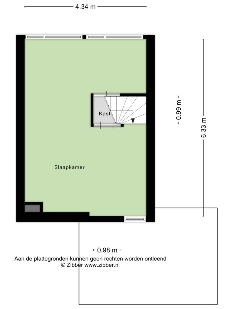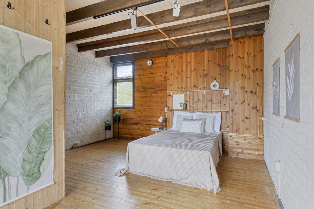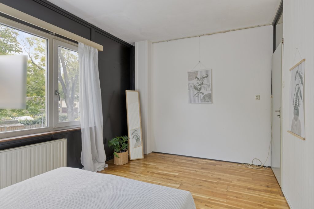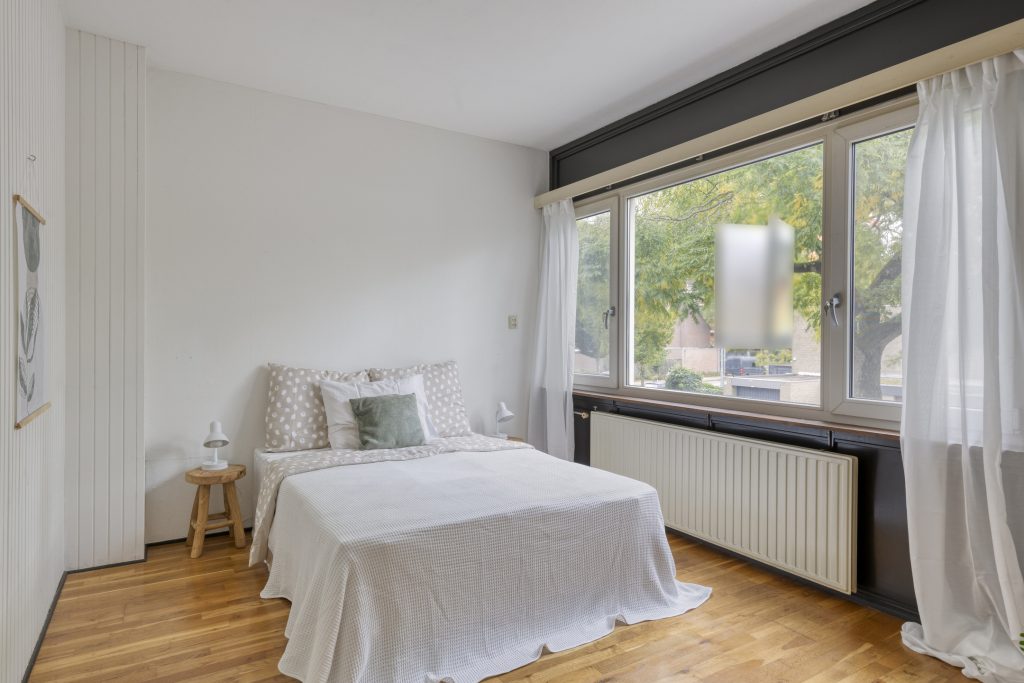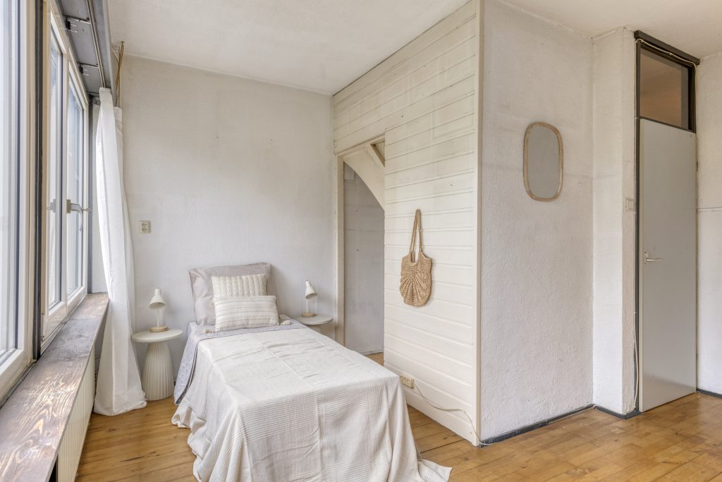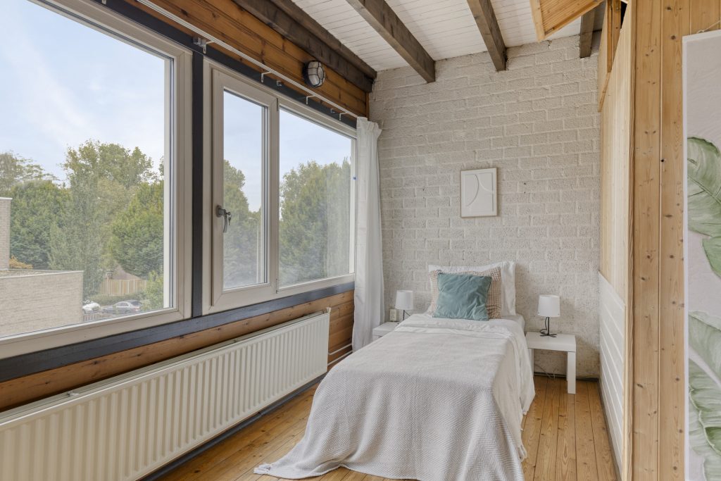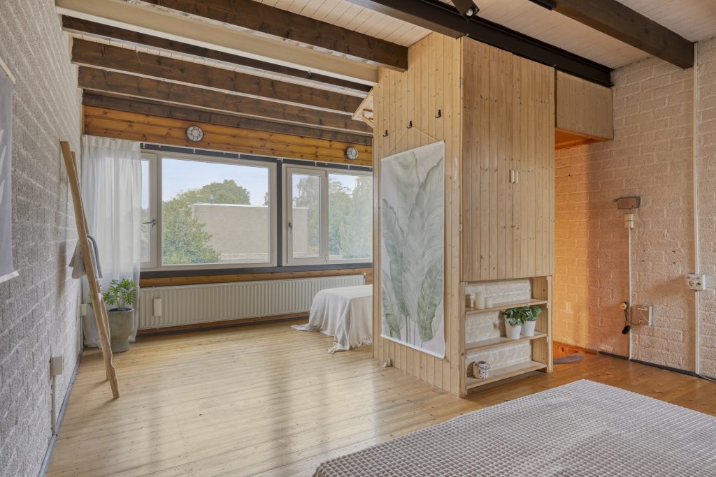 Een vast trap leidt naar de tweede verdieping, die in gebruik is als derde slaapkamer. Hier ervaart u ervaart u een gevoel van vrijheid: de schuine daklijnen, de speelse lichtinval en de vaste kast bij de trap maken dit een kamer met mogelijkheden. Een ideale plek voor een tiener, een logeerplek of misschien wel een werkruimte.
