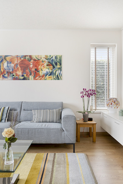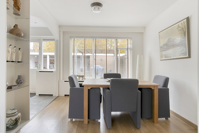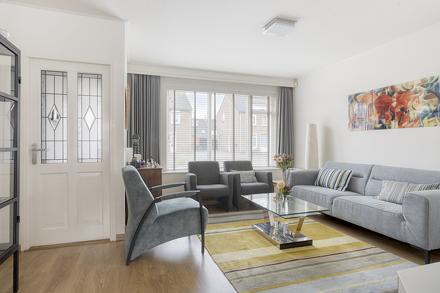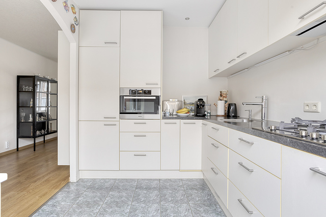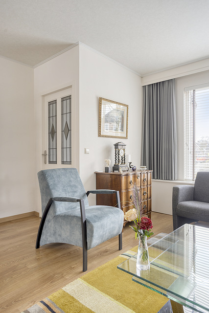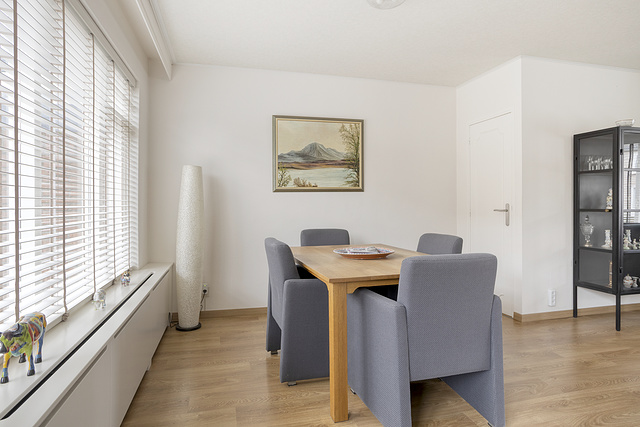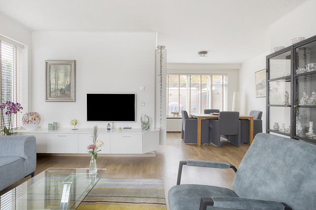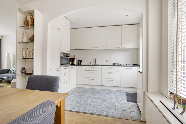 De woonkamer is ruim genoeg om een zitgedeelte en een eetgedeelte te creëren, de open keuken en de lichte inrichting zorgen er mede voor dat de woning zeer ruimtelijk oogt. De deuren met glas in lood, de keurig weggewerkte radiatoren en de strakke wanden laten zien dat er goed nagedacht is over ieder detail.