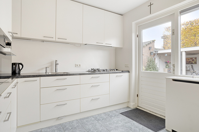De open keuken bevindt zich aan de achterzijde van de woning en is geplaatst in een hoekopstelling. De inbouwapparatuur bestaat uit een combi-magnetron, koelkast, vriezer en 5-pits gaskookplaat, afzuigkap en vaatwasser. Onder de trap is via de woonkamer een praktische vaste kast bereikbaar, welke ideaal geschikt is voor de opslag van uw proviand.