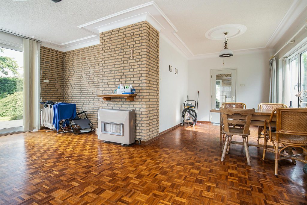 De woonkamer van ca. 40 m2 is gelegen aan de voorzijde van de woning en vanuit hier heeft u direct toegang tot het terras met een prachtig uitzicht op de groene achtertuin. De kamer is afgewerkt met een blokparketvloer, grotendeels stucwerk wanden en een stucwerk plafond met sierlijsten.