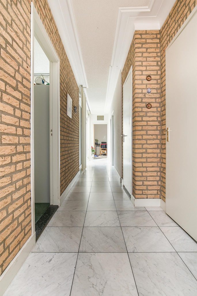 Via de verhoogde entree is de woning bereikbaar. In de ruime hal bevinden zich de toiletruimte, meterkast en een inbouwkast. Ook is er toegang tot de kelder onder het woongedeelte. De centrale hal biedt toegang tot de woonkamer, keuken, 4 slaapkamers en de badkamer.