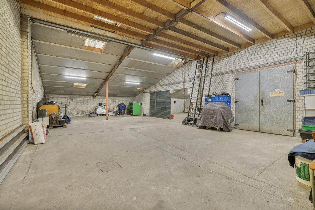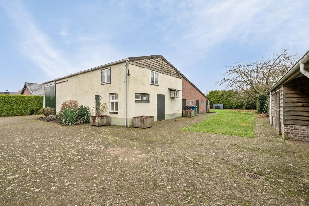 Het 2e deel van de woonboerderij is via het overdekte terras bereikbaar. Hier bevinden zich een hobbyruimte en de inpandige garage. De inpandige hobbyruimte heeft openslaande deuren aan de voorzijde en is voorzien van een laminaatvloer. Een vaste trap geeft toegang tot de overloop op de 1e verdieping. Hier zijn nog eens 2 kamers en een bergruimte gelegen. De aanwezigheid van deze ruimtes maakt het object geschikt voor mantelzorg wonen. De ruime, inpandige garage (48 m2) heeft openslaande garagedeuren aan de achterzijde.