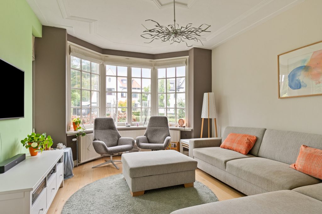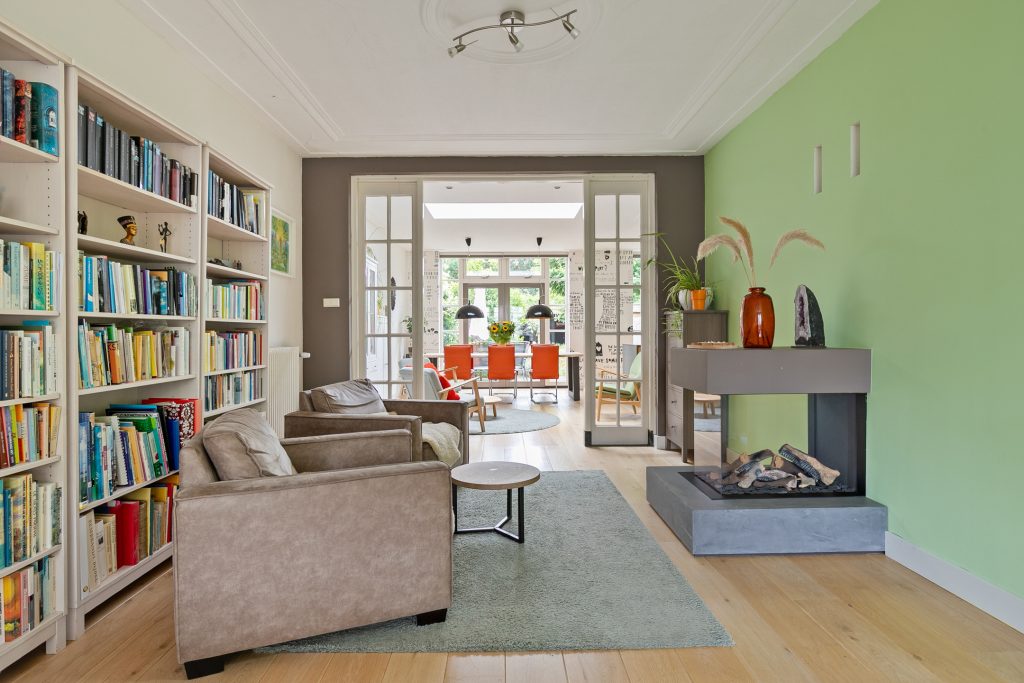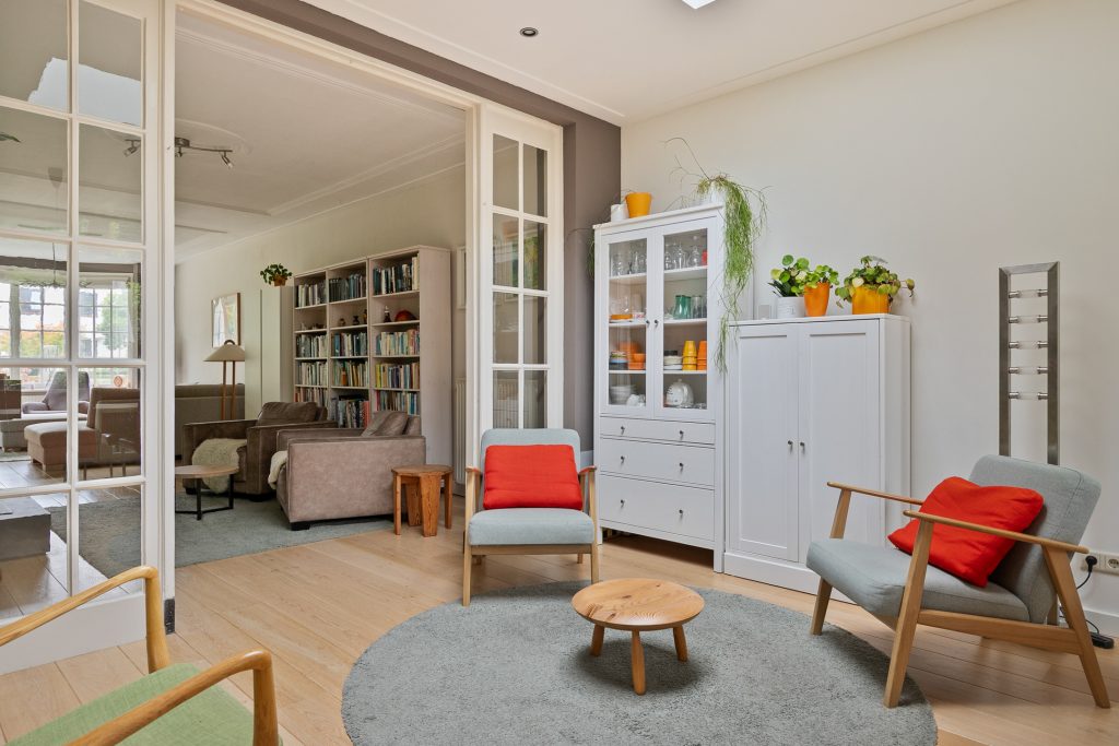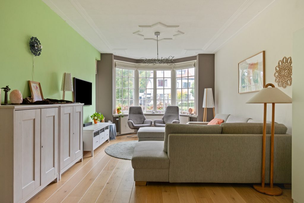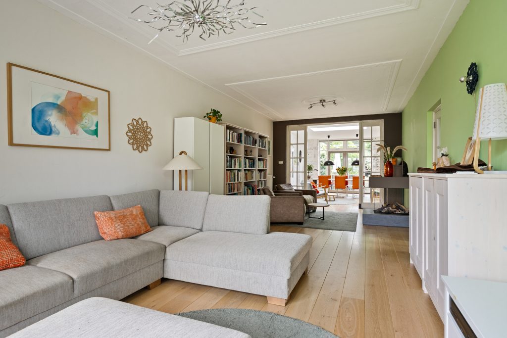 De ruime woonkamer (ca. 40 m2) geniet volop lichtinval dankzij de erker aan de voorzijde. De kamer is afgewerkt met een massief eiken houten vloer en stucwerk wanden en plafond met ornamenten en sierlijsten. In de woonkamer is een sfeerverhogende gashaard aanwezig en aan de achterzijde is er toegang tot de leefkeuken.