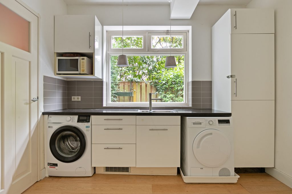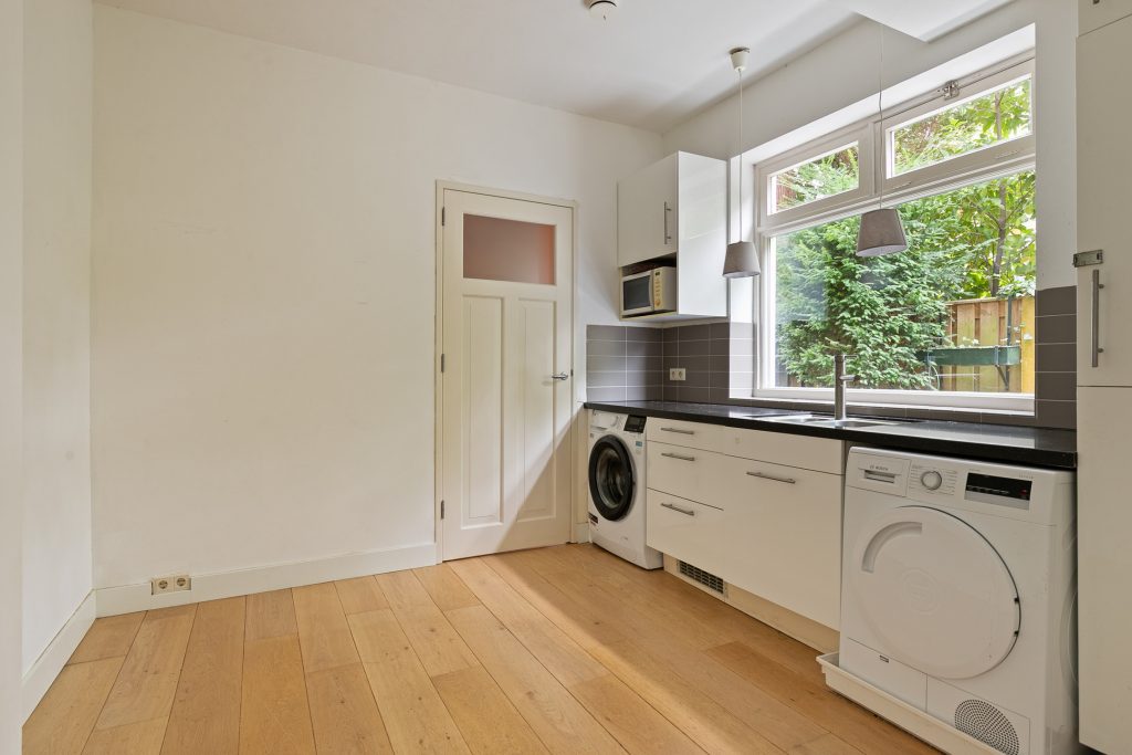 De praktische en ruime bijkeuken beschikt over een keukenblok met spoelbak, werkblad, kastruimte en witgoedaansluitingen.