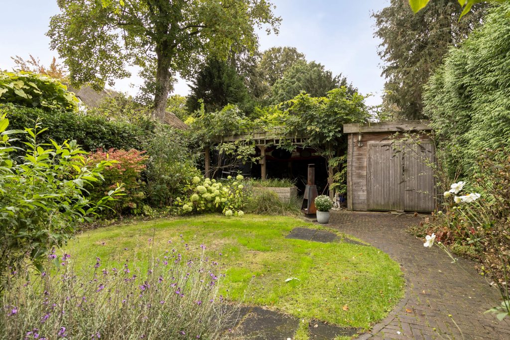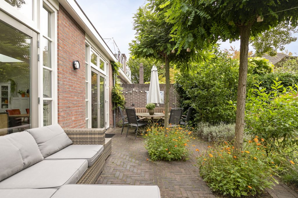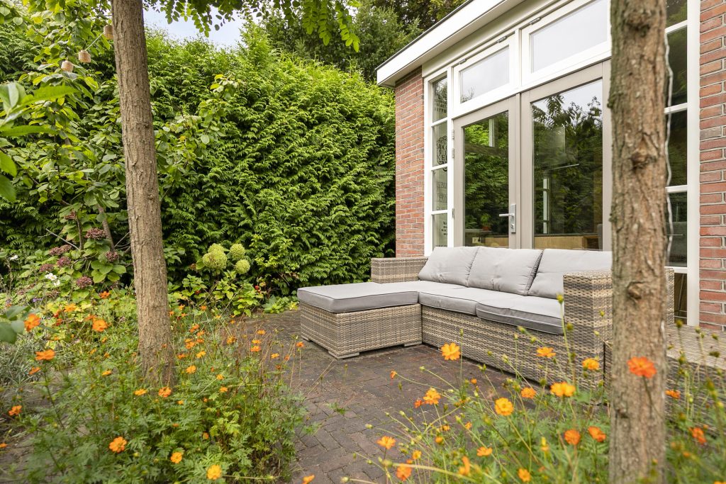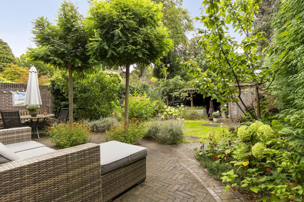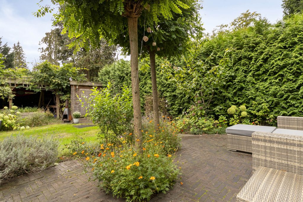 De achtertuin is gelegen op het zuiden en is een “groene oase”. De tuin biedt privacy en heeft een bestraat terras aan de woning, gazon, borders en een tweede overdekt terras annex opslag, achter in de tuin. Hier bevindt zich eveneens de houten tuinberging. Naast de woning is een achterom met poort gelegen naar de oprit.