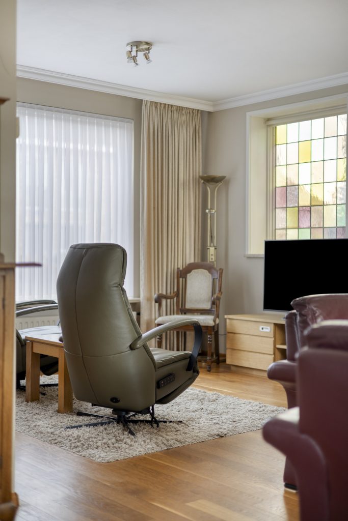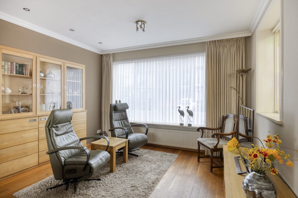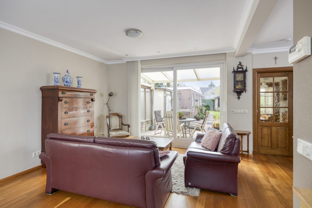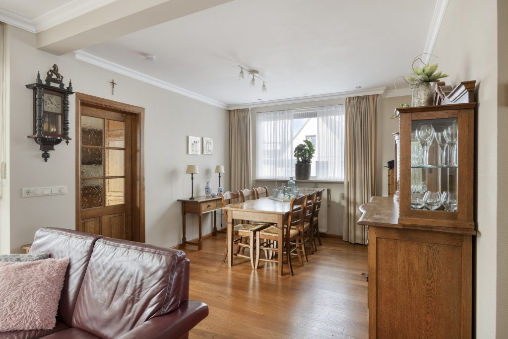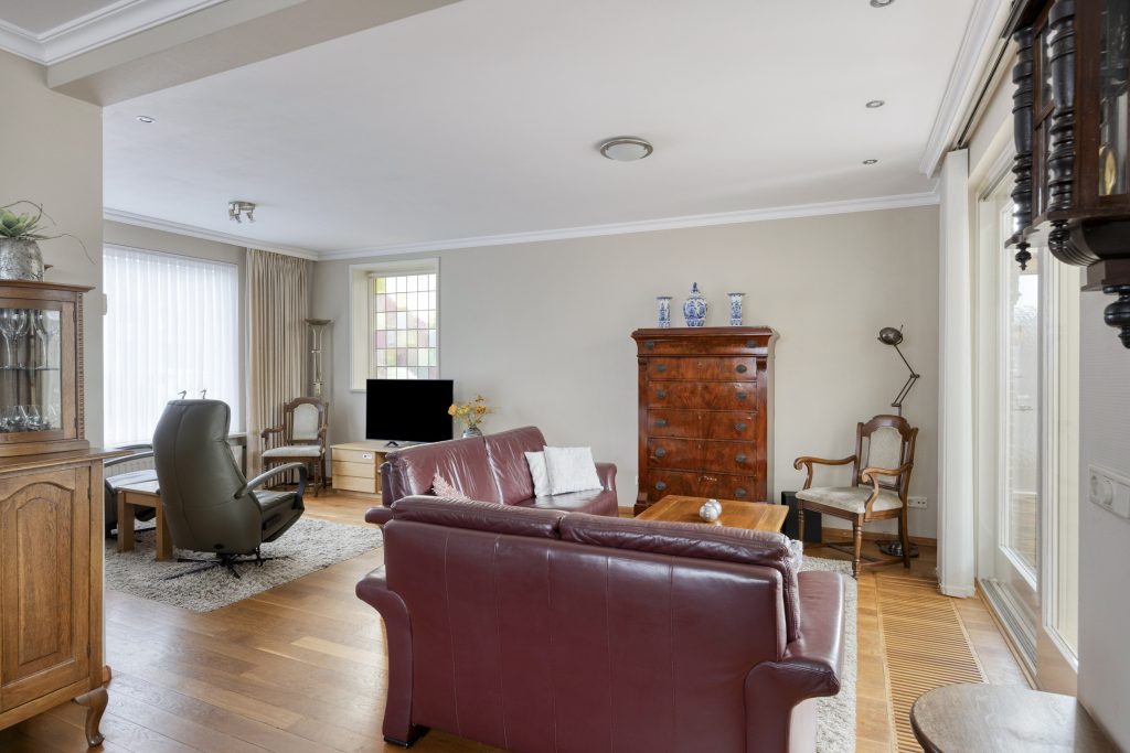 Via de hal met meterkast en trapopgang naar de eerste verdieping bereikt u de L-vormige woonkamer. De woonkamer ademt sfeer dankzij de houten vloer, het glas-in-loodraam en de sierplint aan het plafond. Dankzij de afmetingen is er voldoende ruimte voor zowel een comfortabele zithoek als een ruime eethoek. De schuifpui in de achtergevel verbindt de woonkamer met de terrasoverkapping.