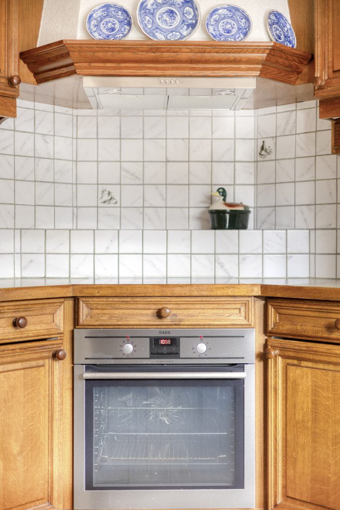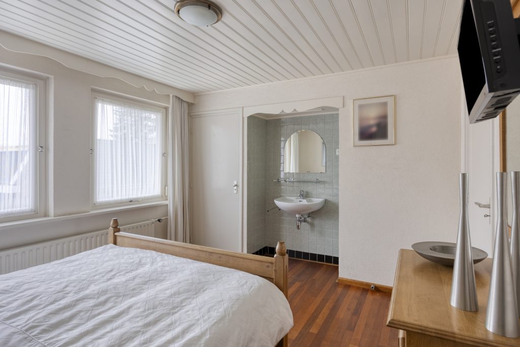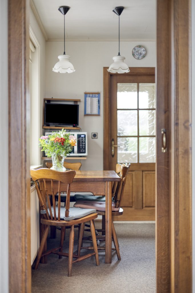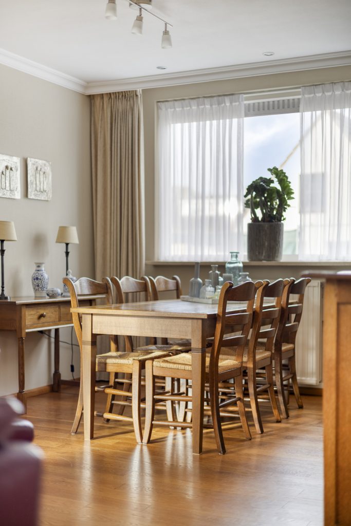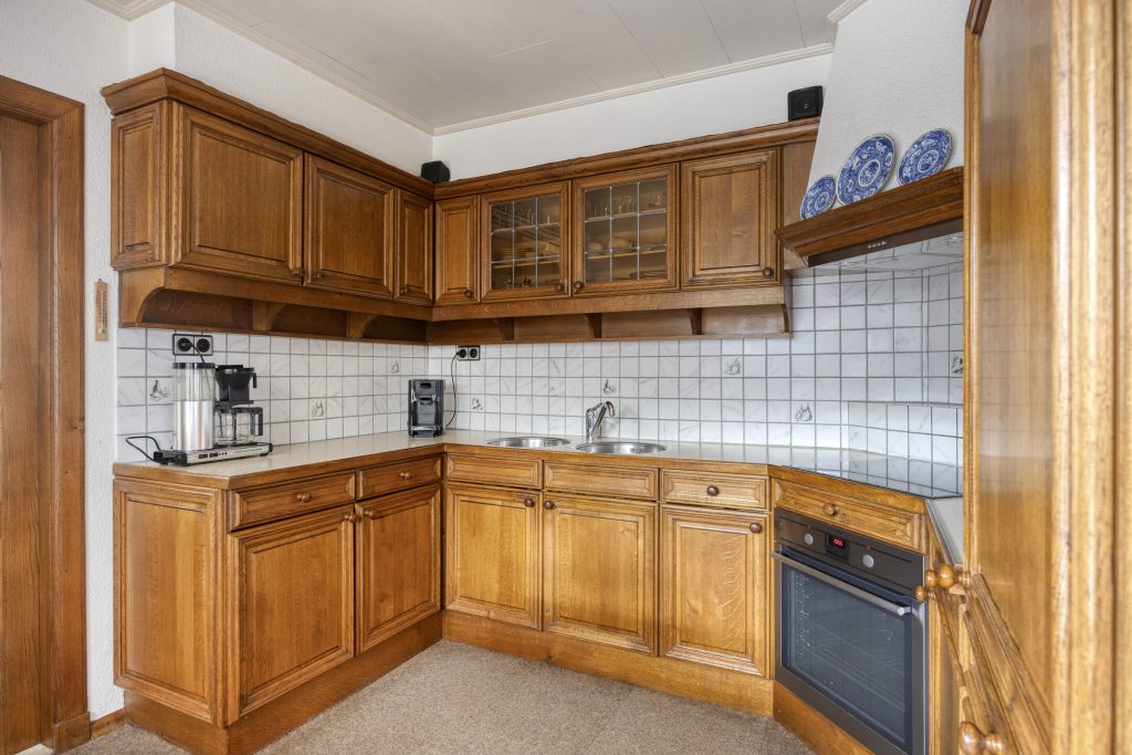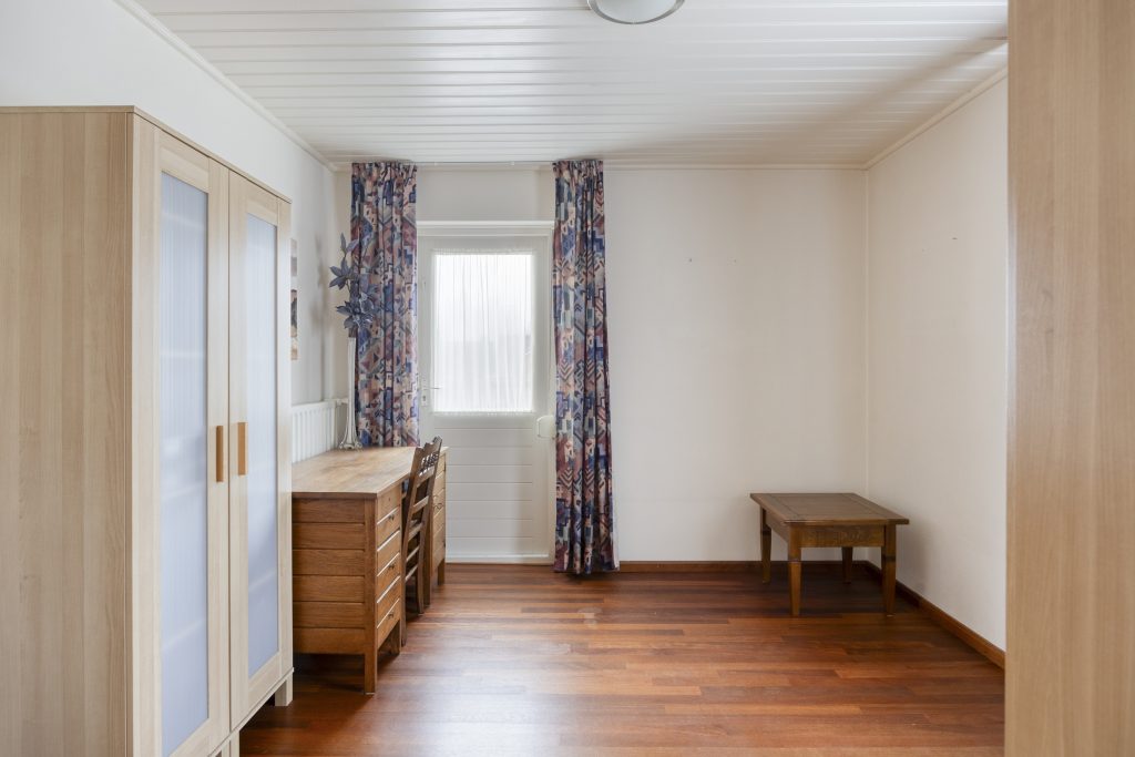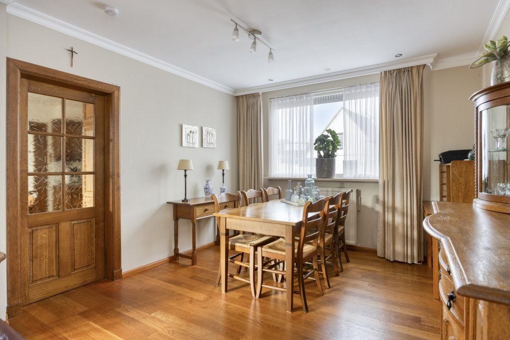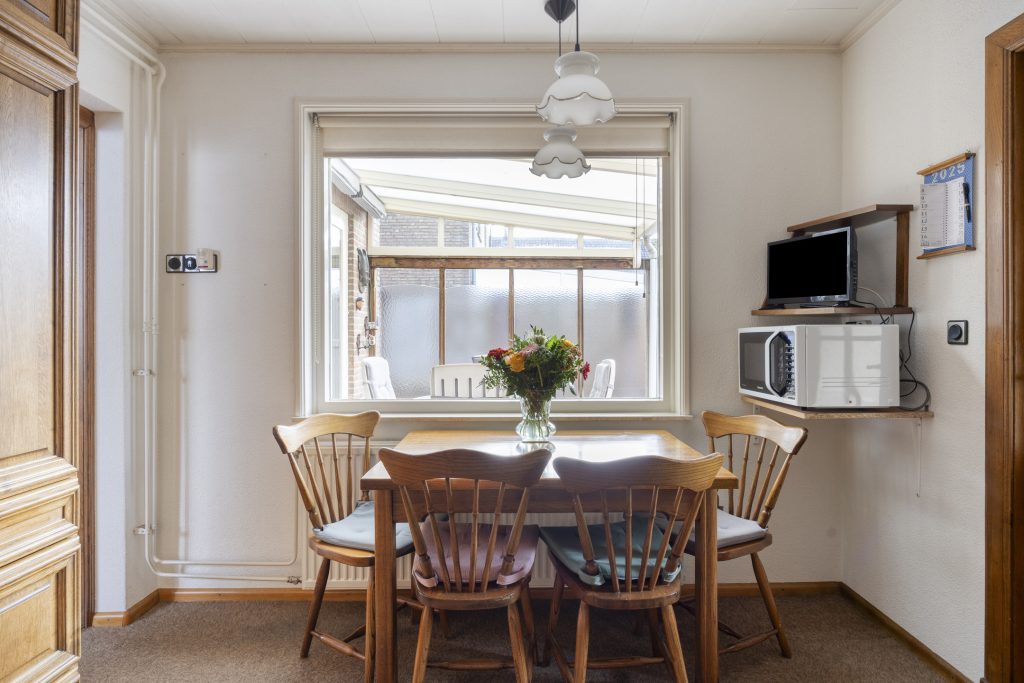 De eethoek grenst aan de dichte keuken, die is uitgevoerd in houten U-opstelling en voorzien van diverse inbouwapparatuur (o.a. koelkast, inductiekookplaat, afzuigkap en oven (niet functionerend)). Maar laten we eerlijk zijn: deze ruimte vraagt om een frisse blik. En precies dát maakt het zo aantrekkelijk. Ziet u het al voor zich? Eén royale woonkamer met open keuken, waar koken en leven naadloos in elkaar overlopen. De ruimte is er, uw ideeën geven het geheel vorm.
