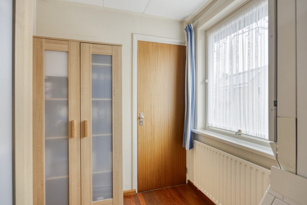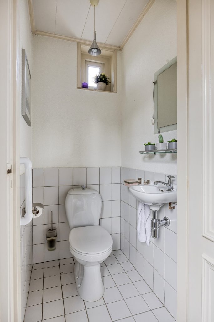Achter de keuken bevindt zich nog een hal met inbouwkast en toiletruimte. Vanuit deze hal is tevens de achtertuin te bereiken.
