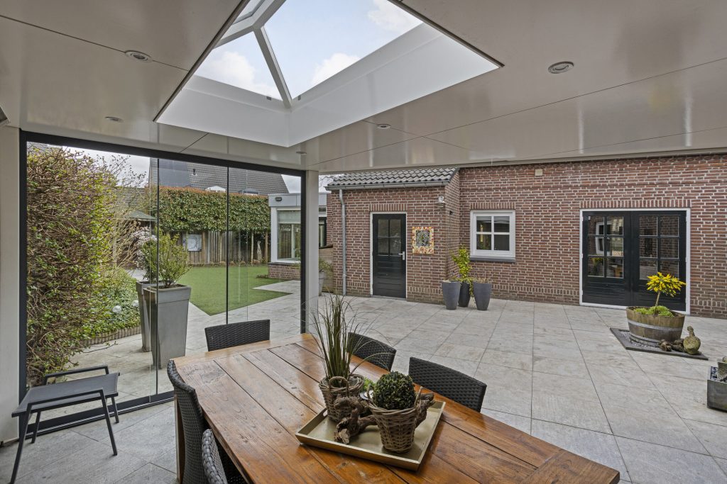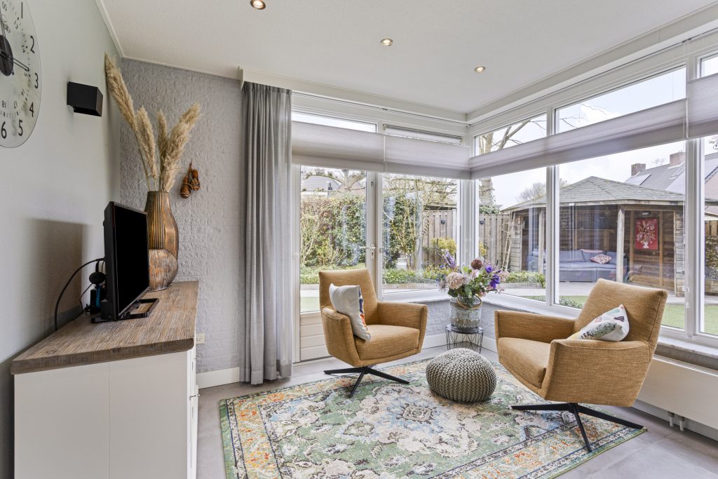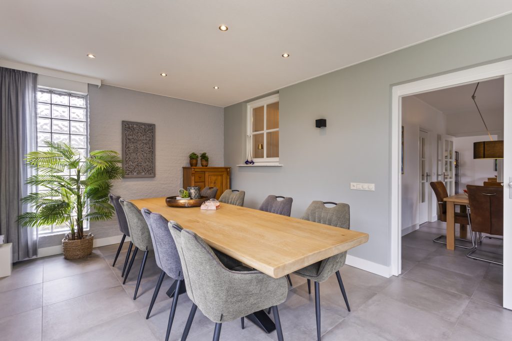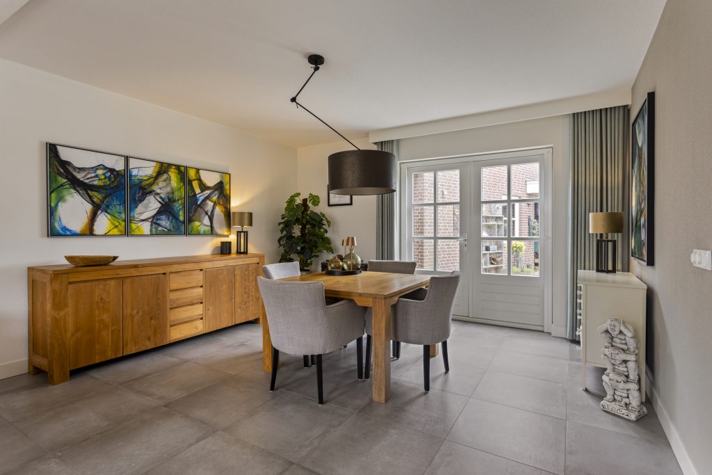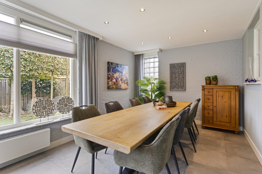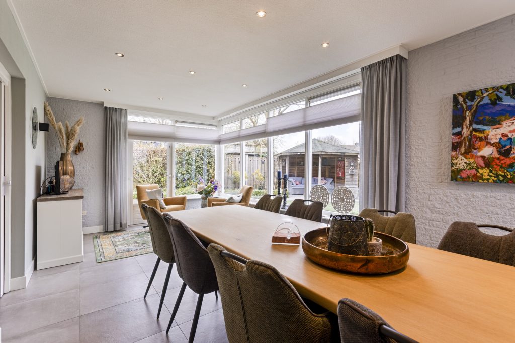 Aan de rechterzijde bevindt zich de tuinkamer, uitgerust met een royale pui. Deze ruimte is voorzien van dimbare inbouwspots en biedt de perfecte gelegenheid om uw gasten te verrassen. Via een toegangsdeur heeft u directe toegang tot de achtertuin.