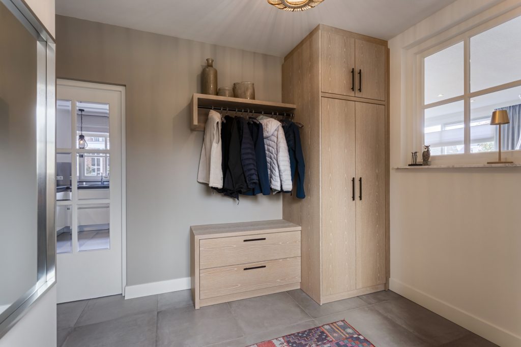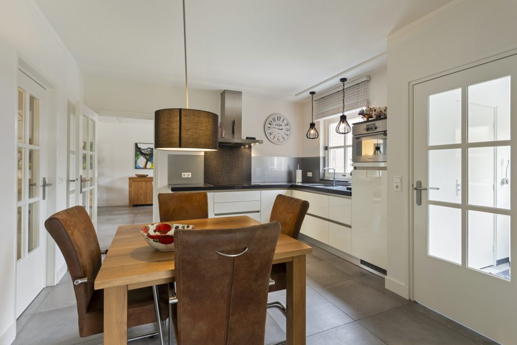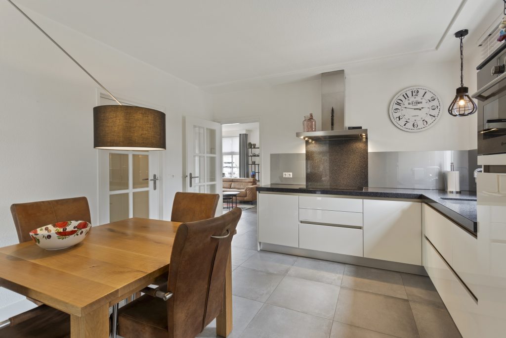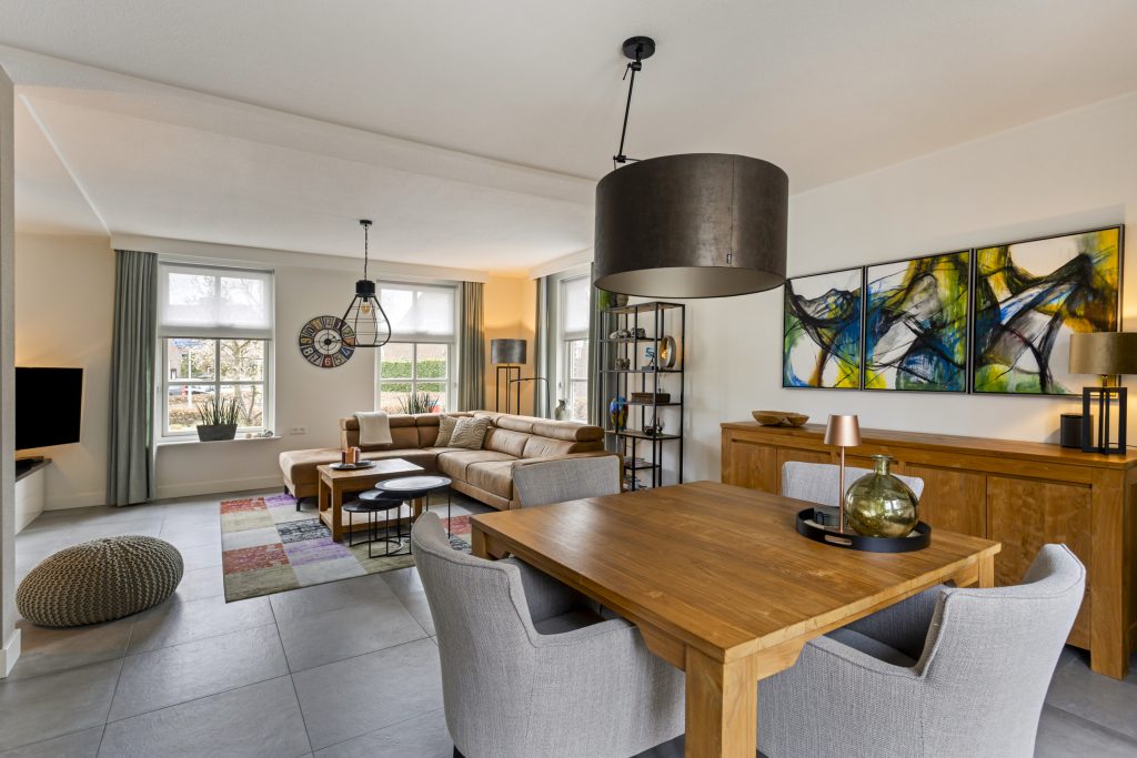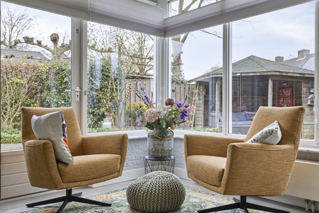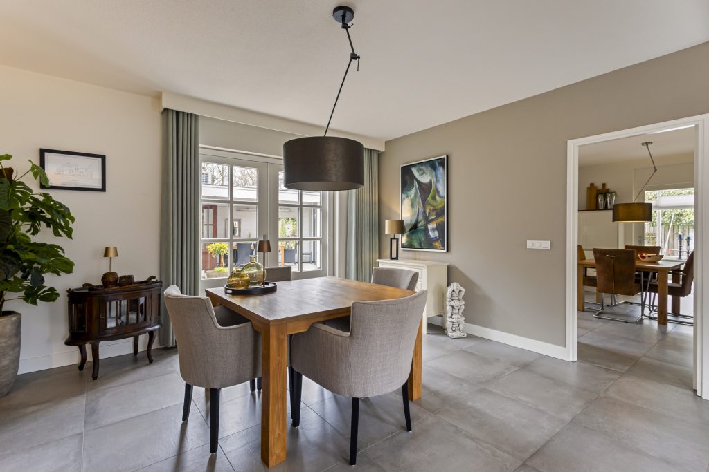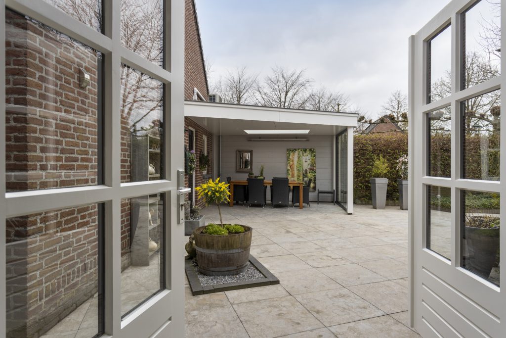 Aan de rechterzijde bevindt zich de tuinkamer, uitgerust met een royale pui. Deze ruimte is voorzien van dimbare inbouwspots en biedt de perfecte gelegenheid om uw gasten te verrassen. Via een toegangsdeur heeft u directe toegang tot de achtertuin.