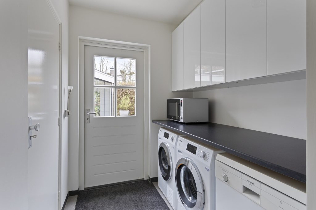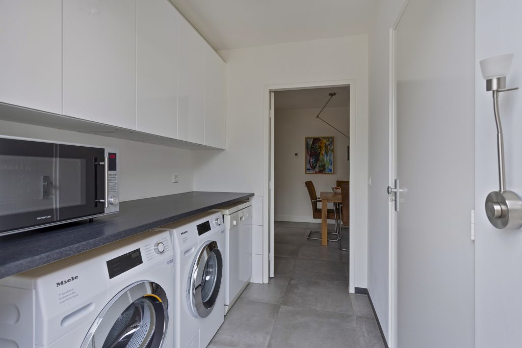Middels een toegangsdeur in de living bereikt u de woonkeuken in hoogglans afwerking, met composiet blad in L-vormige opstelling. De keuken omvat een 4-pits inductie kookplaat met afzuigkap, koelkast, 3-lade vriezer en een combi-oven/magnetron. Aangrenzend de keuken situeert zich de bijkeuken met kastenruimte en vaatwasser, hier bevinden zich de aansluiting voor wasmachine en droger, daarnaast bereikt u middels een deur de tuin.