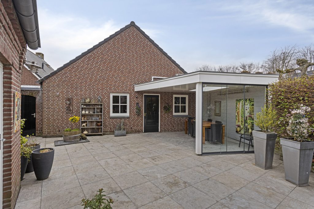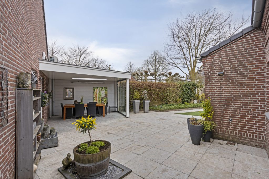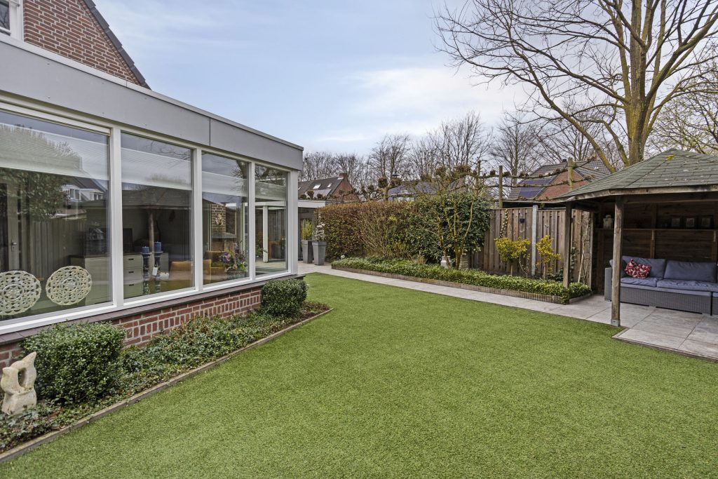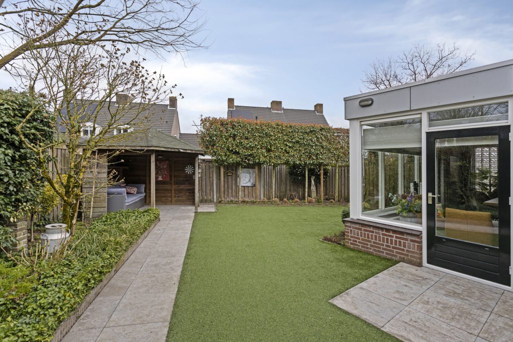 Vanuit de oprit heeft u via een eigen achterom toegang tot de onderhoudsvriendelijke achtertuin van de woning. De achtertuin is voorzien van betegeling, kunstgras, diverse plantenborders en volwassen bossage. Daarnaast is zowel de voor-als achtertuin voorzien van een beregeningsysteem, houten prieeltje en een gezellige overkapping met een heater, lichtstraat en inbouwspots welke deels afsluitbaar is middels glazen schuifpanelen.