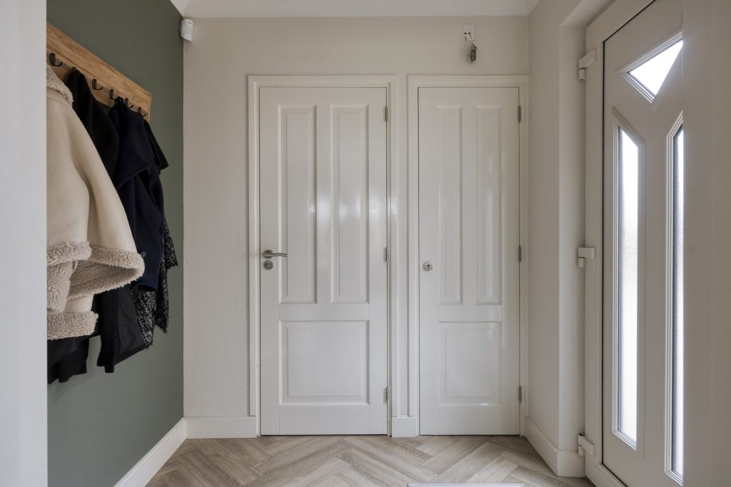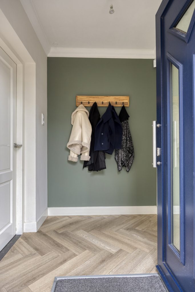 Via de rustige straat en eigen oprit is de woning bereikbaar. In de hal bevinden zich de meterkast, garderobe en volledig betegelde toiletruimte met hangend toilet en fonteintje. Vervolgens is er toegang tot de woonkamer.