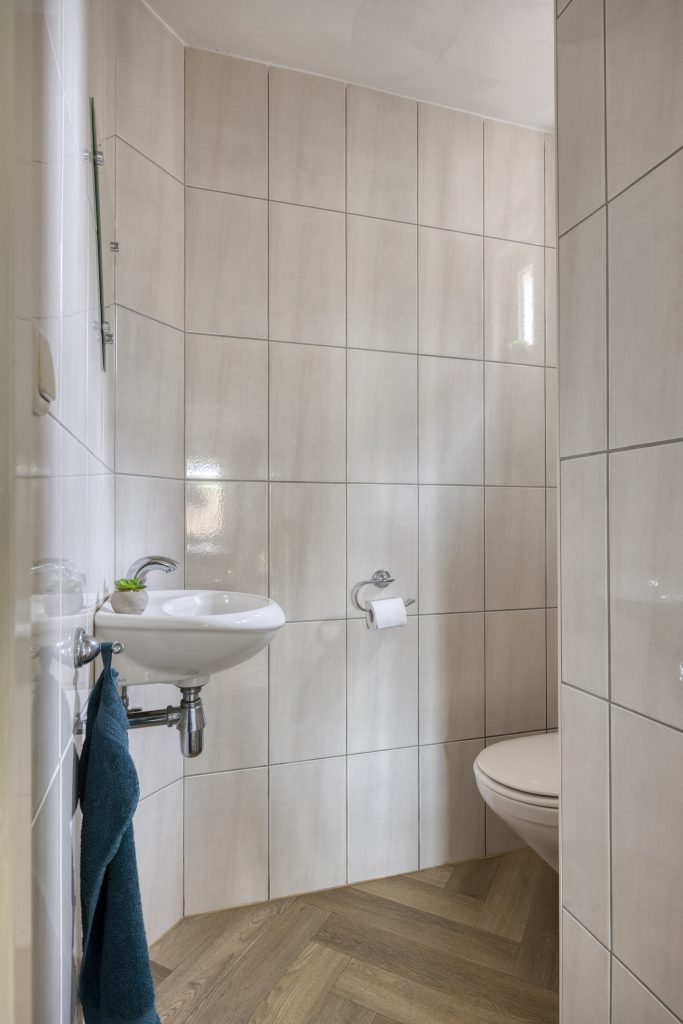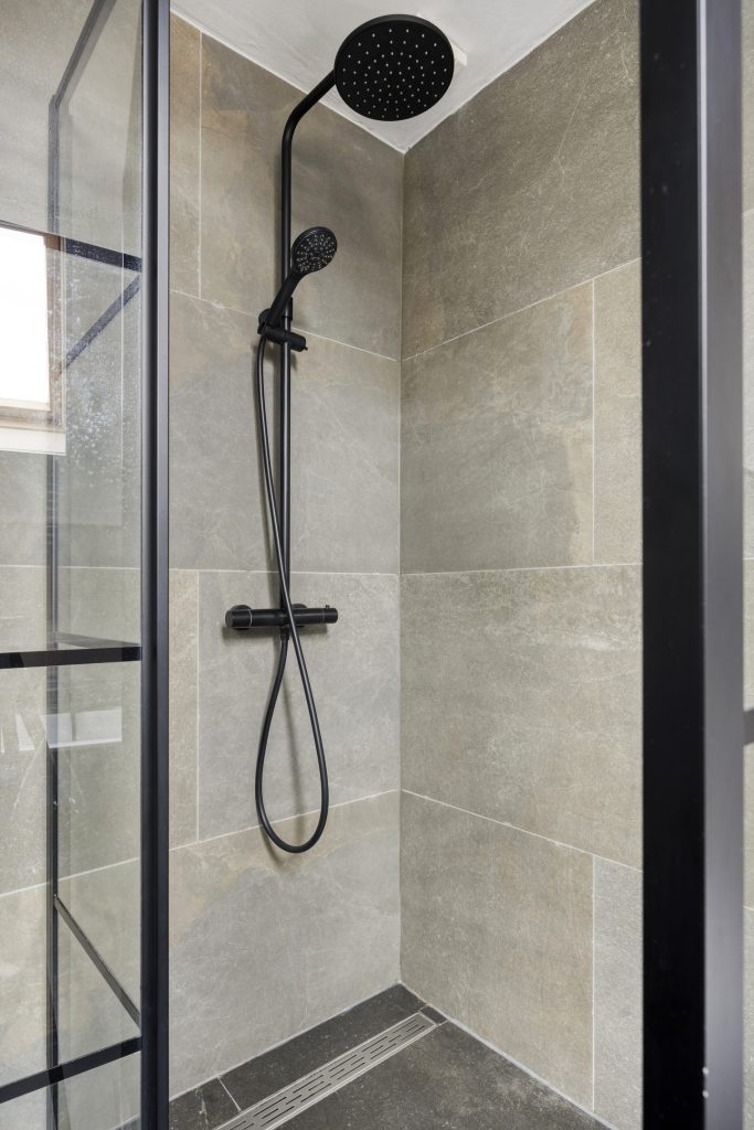 De badkamer is in 2022 vernieuwd en voorziet in een inloopdouche, ligbad, hangend toilet, wastafelmeubel en designradiator. Een dakvenster zorgt voor lichtinval en in het plafond is inbouwverlichting aanwezig.