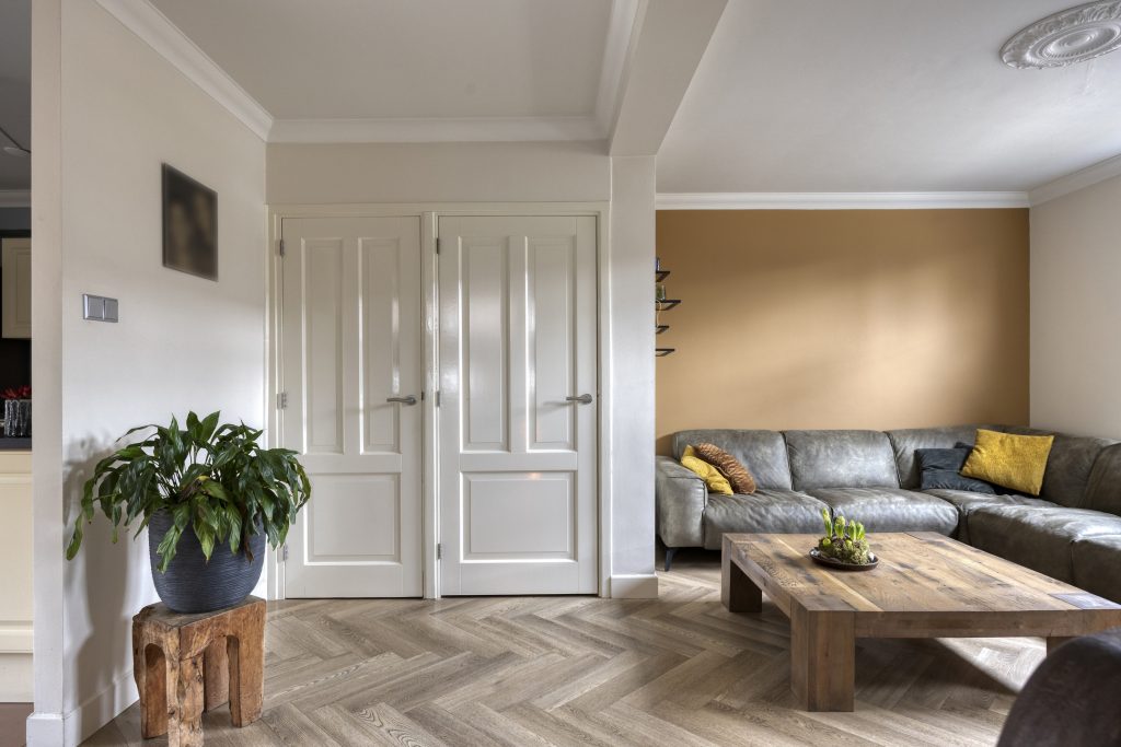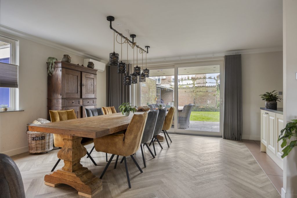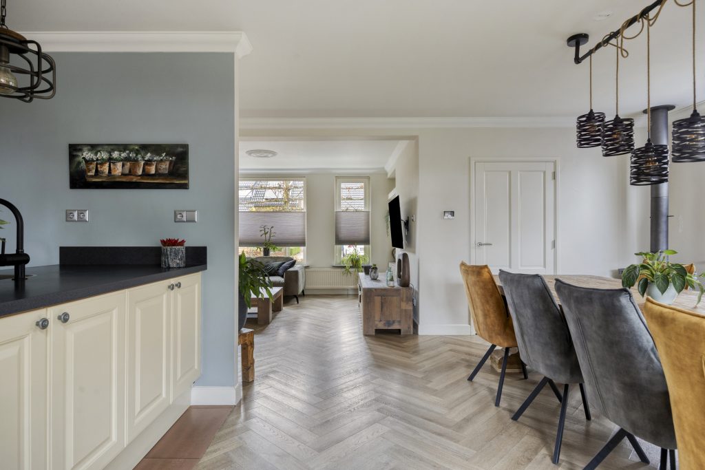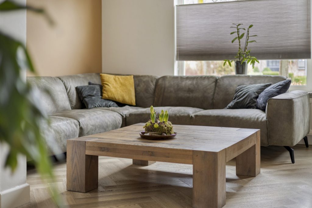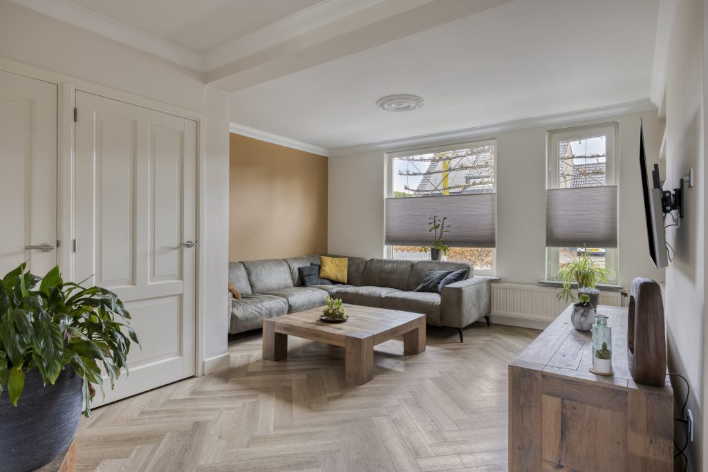 De Z-vormige woonkamer is volledig in lichte tinten afgewerkt met pleisterwerk stucwerk wanden en plafond met o.a. sierlijsten. Het zitgedeelte is aan de voorzijde gelegen en het eetgedeelte bevindt zich aan de achterzijde. Hier is een sfeervolle houtkachel aanwezig, alsmede airco-unit. Een schuifpui geeft toegang tot een overdekt terras in de tuin. De hal en woonkamer zijn belegd met een pvc vloer in visgraadmotief.