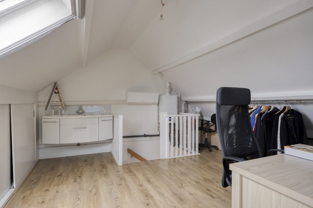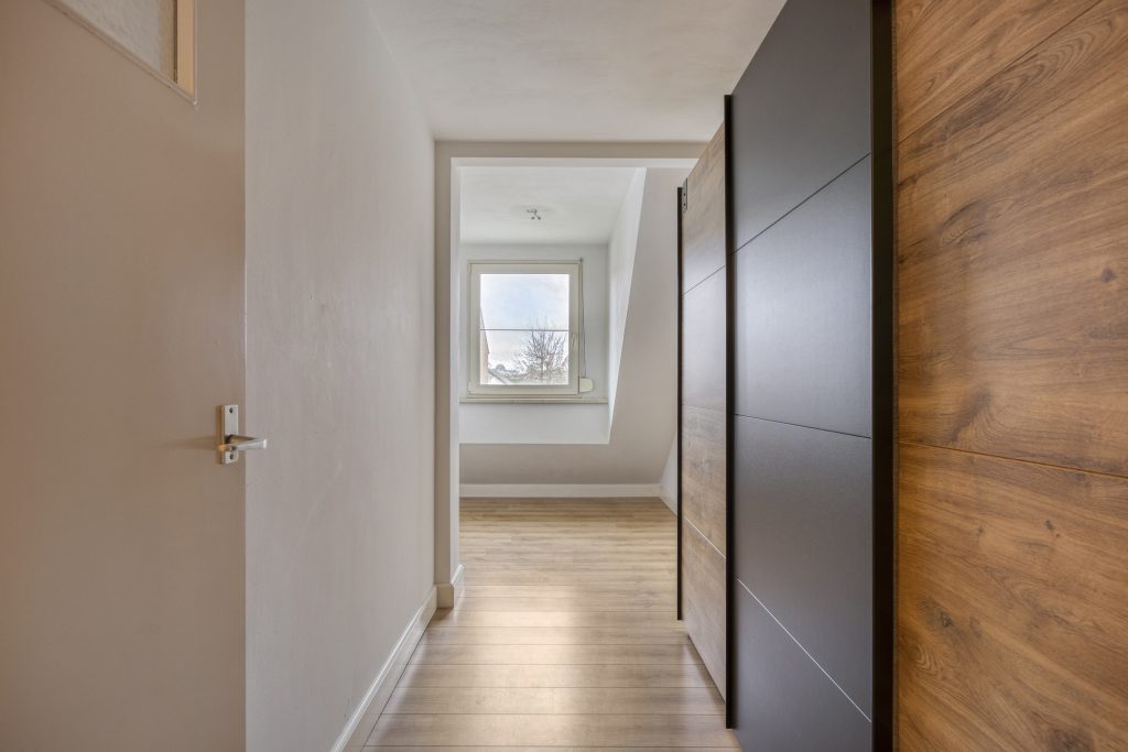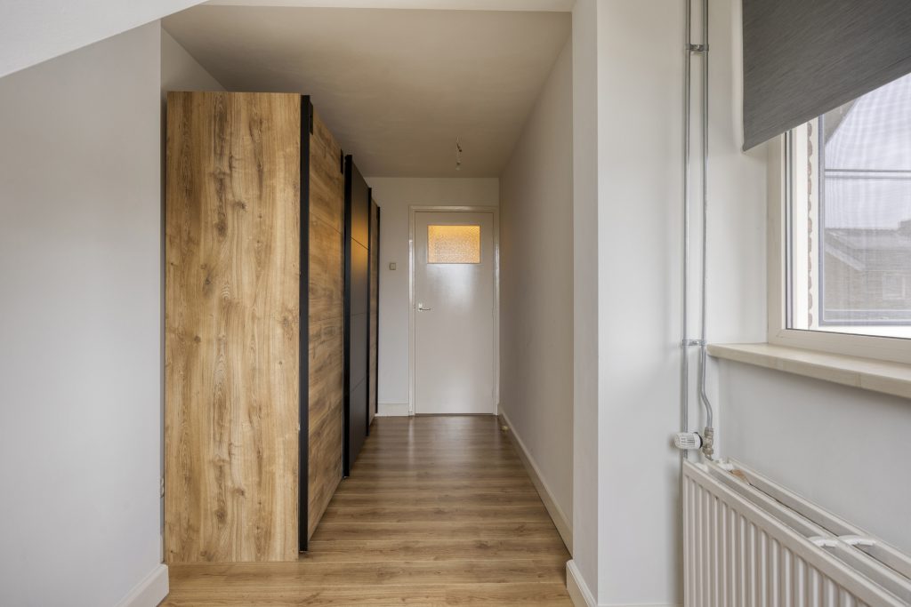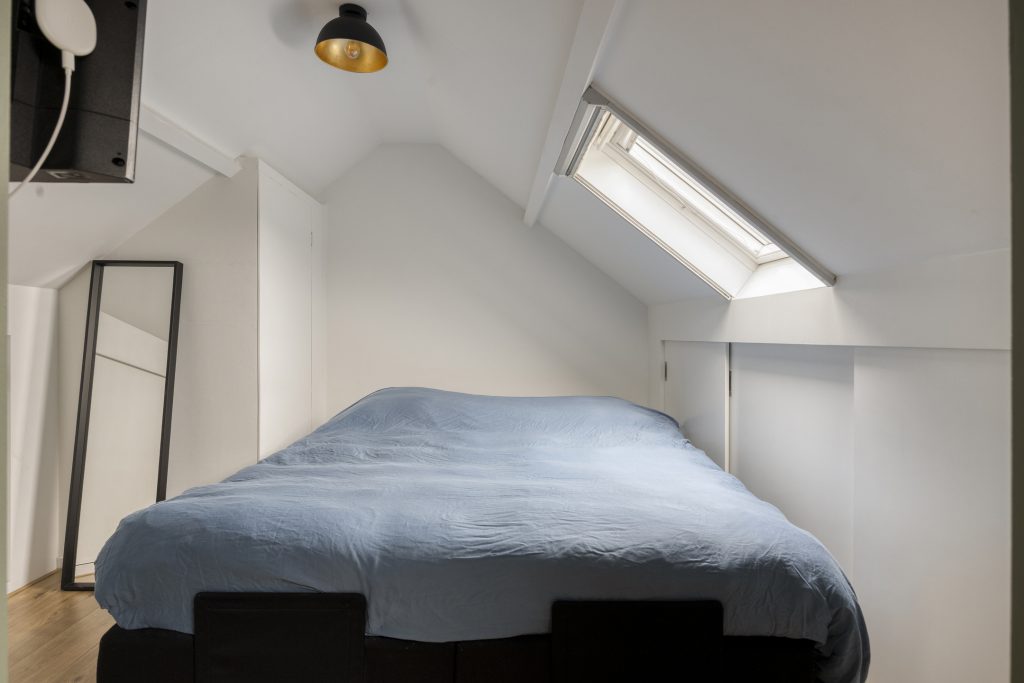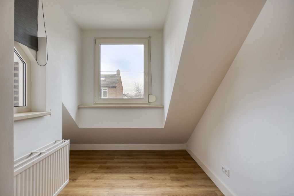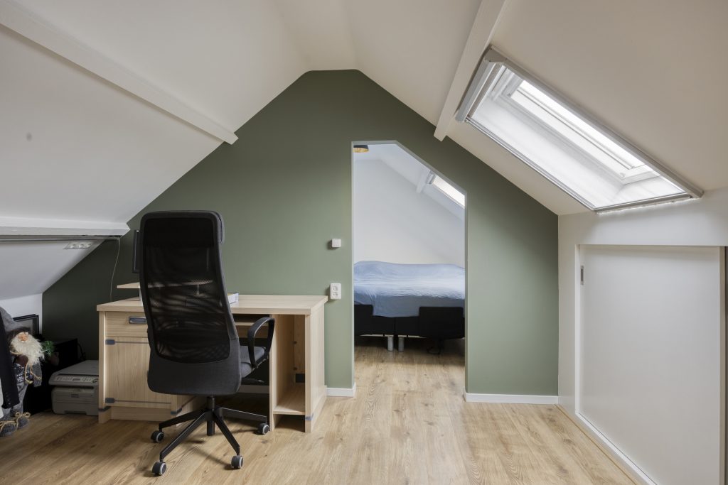 Vervolgens is de 5e slaapkamer bereikbaar. Ook deze kamer heeft schuifwandkasten, een dakvenster en is afgewerkt met een laminaatvloer.