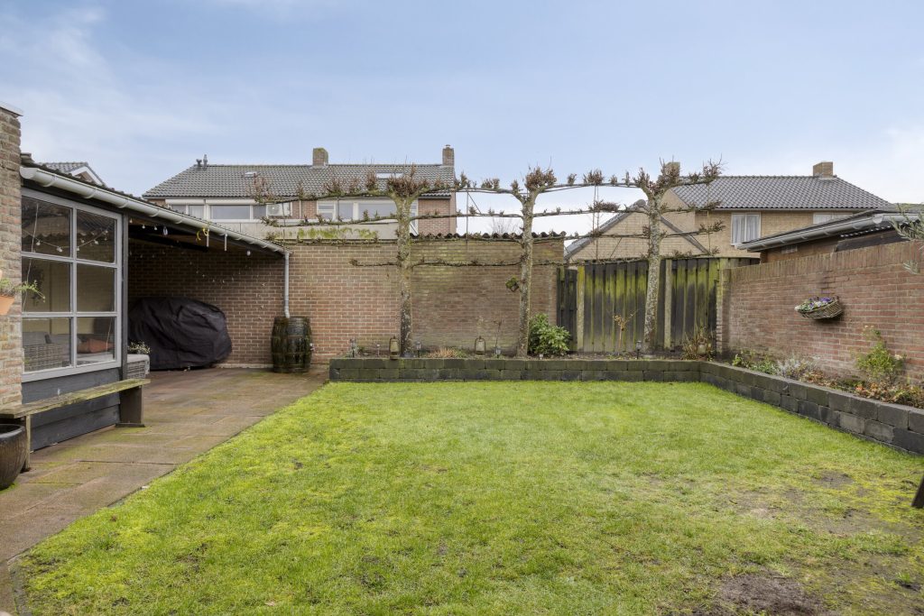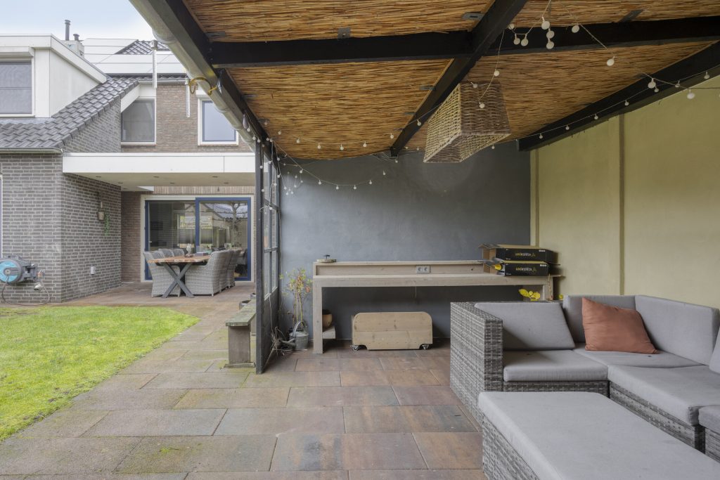 Dit overdekte terras beschikt over inbouwverlichting en een lichtstraat en geeft toegang tot de afsluitbare carport annex garage. Deze ruimte is voorzien van openslaande deuren, verlichting en elektra en heeft een extra berging. In de tuin is nog een 2e overdekt terras gelegen. De tuin is aangelegd met een gazon, verhoogde borders en enkele bomen,.