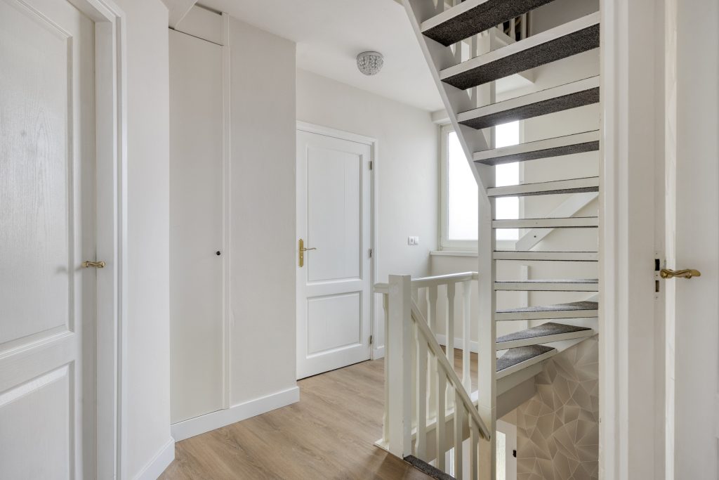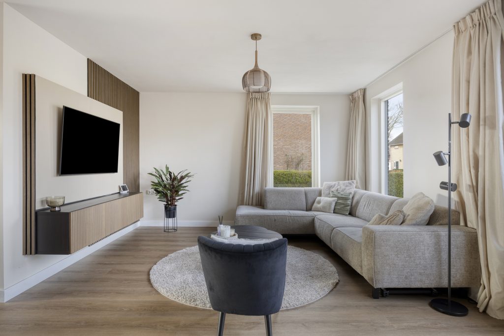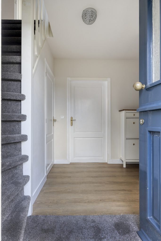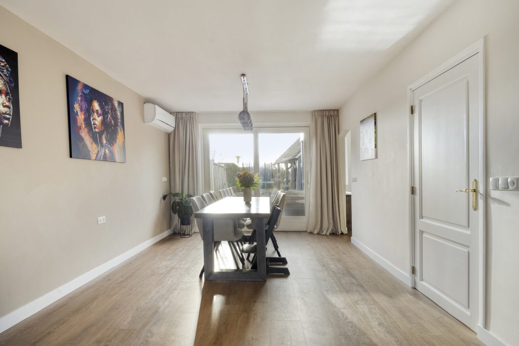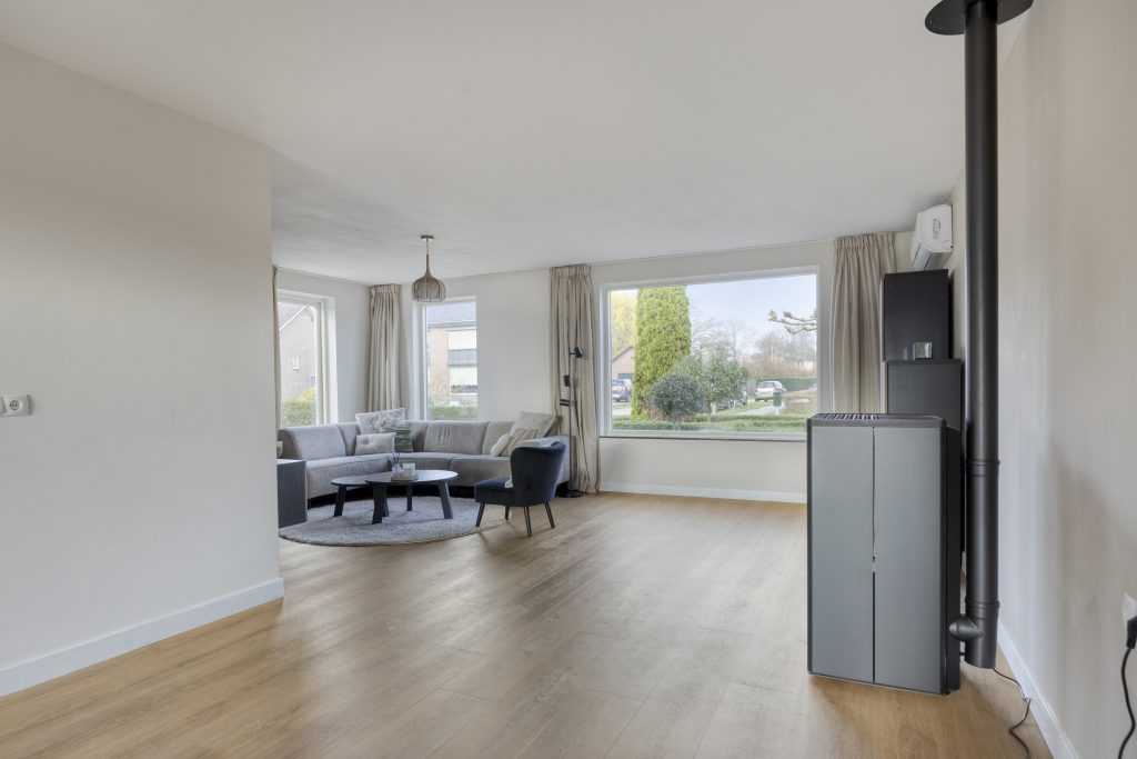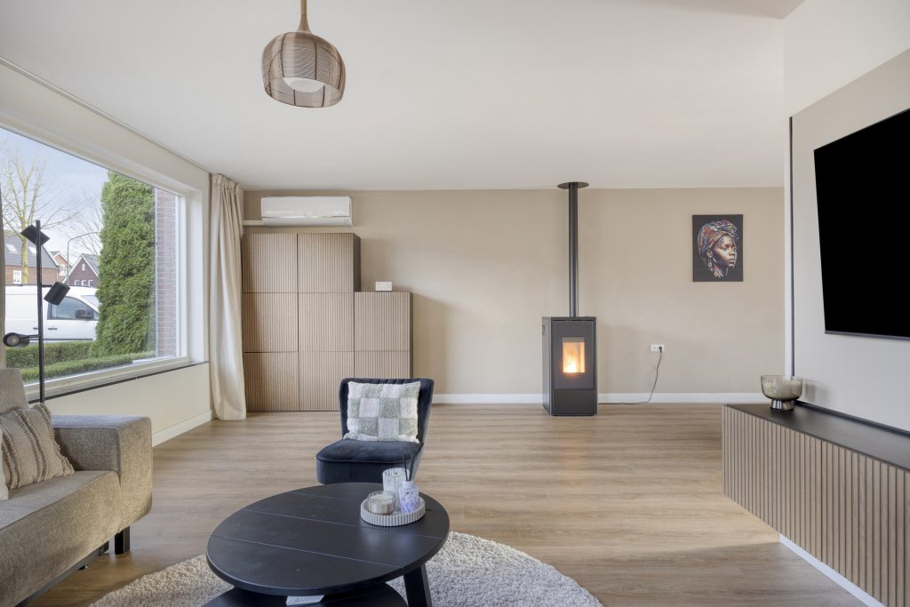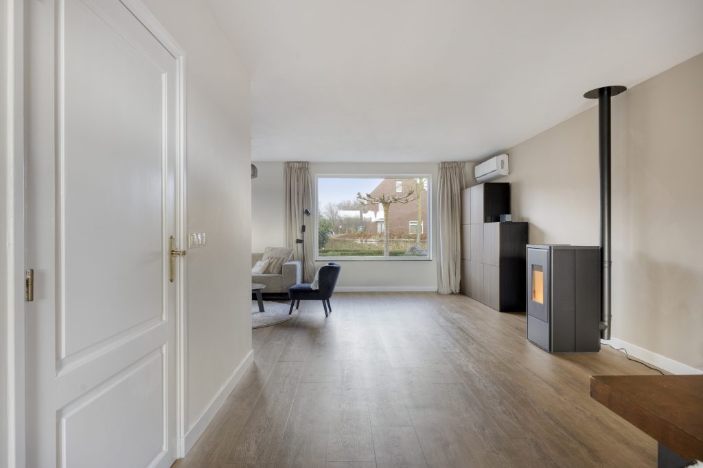 Via de ruime oprit is de woning bereikbaar. In de hal bevinden zich de gemoderniseerde, uitgebreide meterkast, moderne toiletruimte, trapkast en de trapopgang. Vervolgens is de ruime L-vormige woonkamer toegankelijk. De woonkamer is voorzien van een moderne pvc vloer en stucwerk wand- en plafondafwerking en geniet dankzij de ruime raampartijen van volop lichtinval. Aan de achterzijde geeft een schuifpui toegang tot de tuin. In de woonkamer zijn een pelletkachel en 2 airco-units aanwezig.