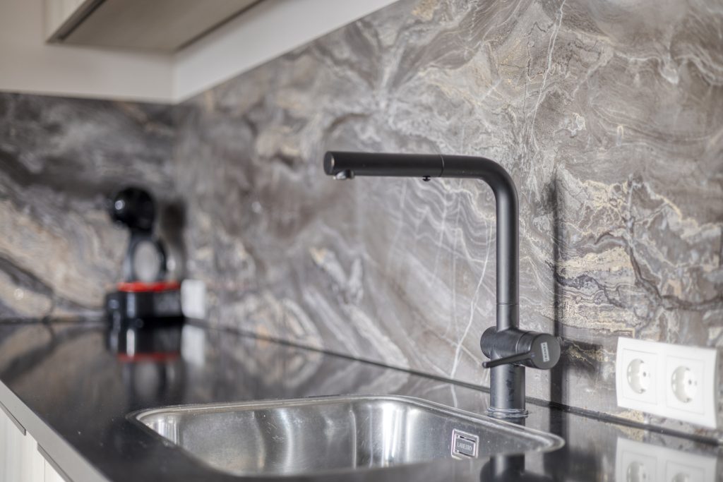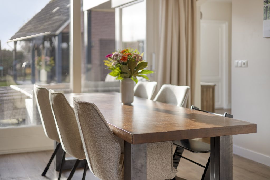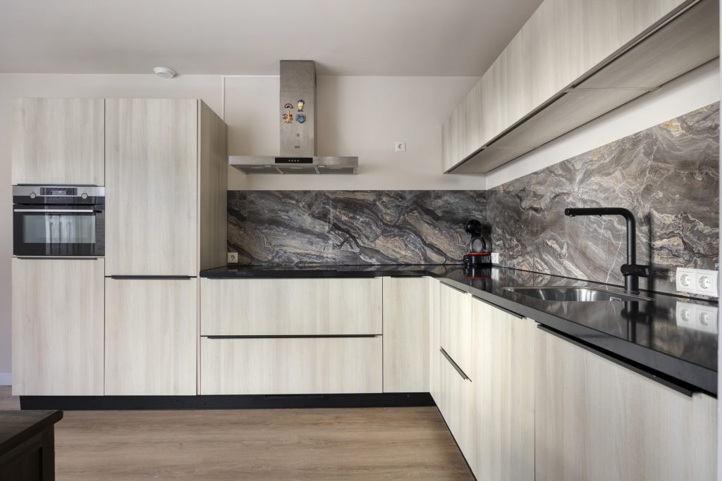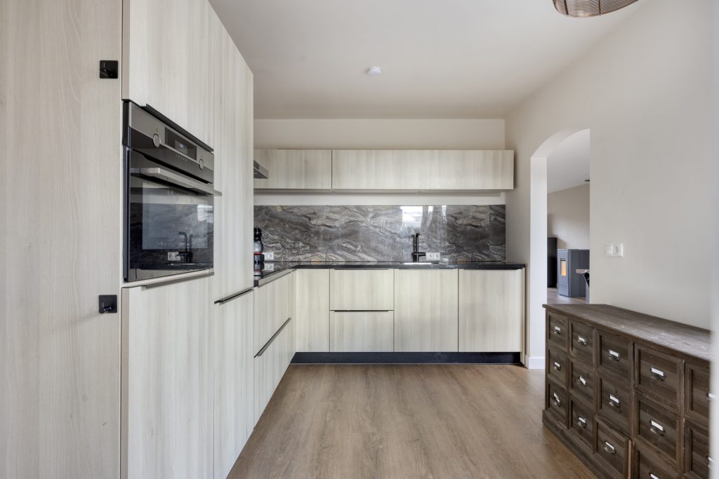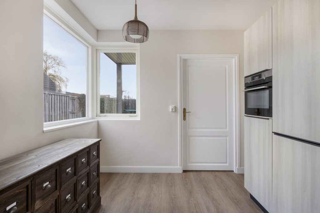 Aan de achterzijde is de keuken gelegen die in 2024 voorzien is van een andere keukeninrichting. De uitrusting is in hoekopstelling geplaatst en voorzien van een inductie kookplaat, afzuigkap, combi-magnetron, vaatwasser, koelkast en vrieslades. Aan de keuken bevindt zich een portaal met witgoedaansluitingen en toegang tot de tuin.