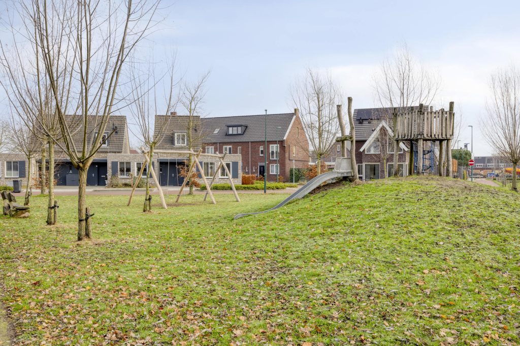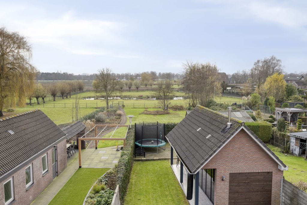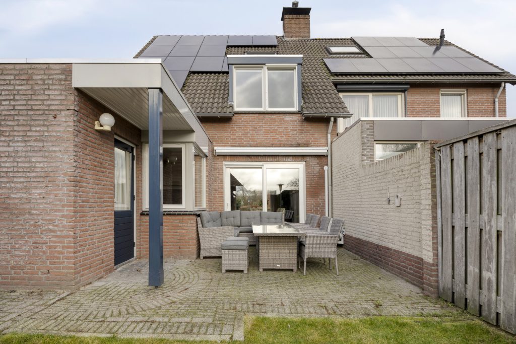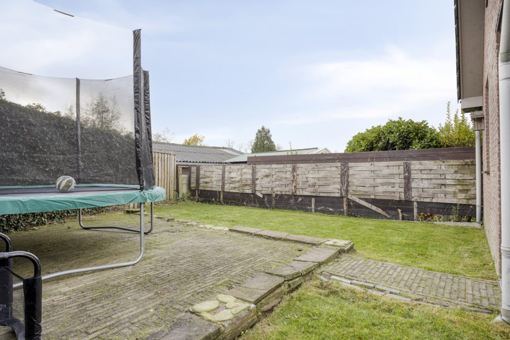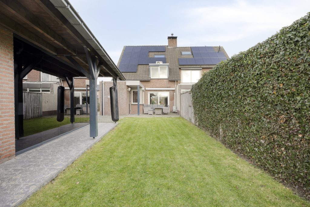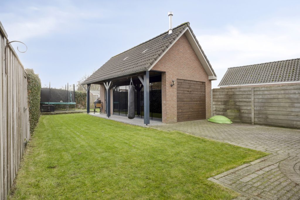 De achtertuin is gelegen op het zuiden en beschikt over een gazon, bestrating en geef toegang tot de oprit. In de tuin is een overdekt terras gelegen dat dankzij glazen schuifpuien is af te sluiten. Een pelletkachel zorgt ervoor dat de ruimte ook verwarmd kan worden. Aan dit terras is een berging aanwezig, die via een losse trap een ruime bergzolder bereikt.