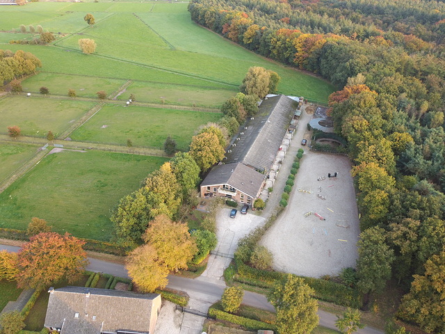 Het middengedeelte, het bedrijfsgedeelte, bestaat uit 7 gangen met ieder zijn eigen hoge toegangspoort, elk makkelijk te bereiken via de eigen oprit. Momenteel zijn 5 gangen ingericht met ieder 5 demontabele paardenboxen en de overige 2 gangen worden momenteel gebruikt voor opslag, een riante werkplaats/ technische ruimte en een wasplaats. Deze gangen zijn tevens binnendoor via de bijkeuken van het hoofdappartement te bereiken. Het gastenverblijf met eigen keuken heeft ruim zicht in de goed verlichte binnenmanege. De binnenmanege is ca. 38 x 18 m. en is voorzien van een grote schuifdeur in de zijgevel. U kunt zich voorstellen dat deze locatie zich, buiten paardenhouderij, ook uitstekend leent voor vele andere doeleinden. Bijv. de stalling van caravans, uw collectie auto’s, het opzetten van een zorgboerderij. Vele creatieve ideeën kunnen op deze locatie bewaarheid worden.