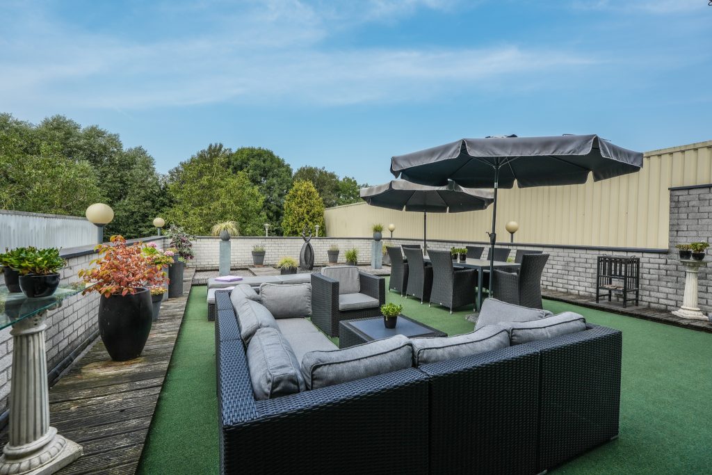 – Het dakterras is een echte eyecatcher: stijlvol ingericht met ruimte voor een loungehoek en eettafel, onderhoudsvriendelijk afgewerkt en omgeven door groen.