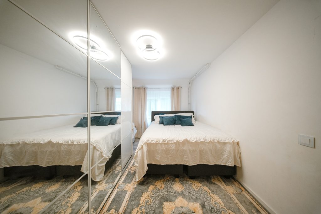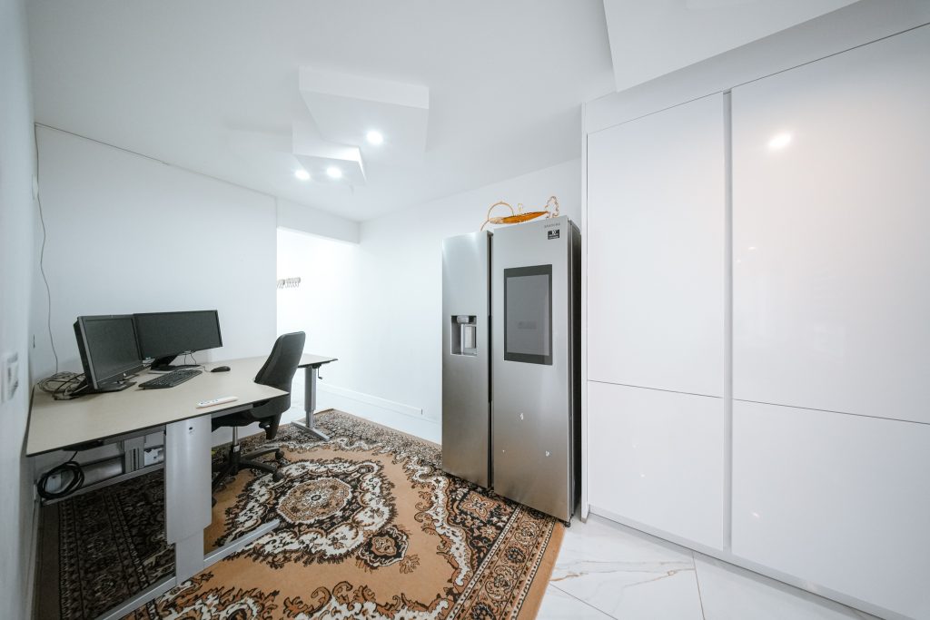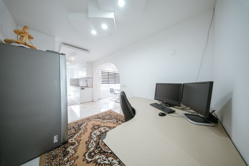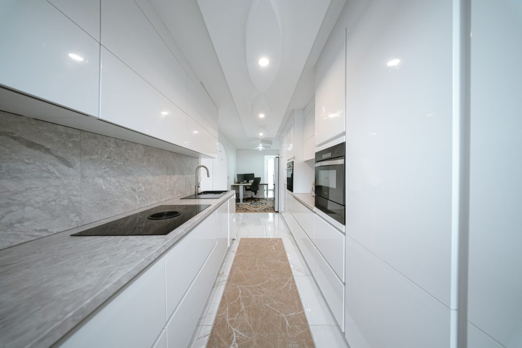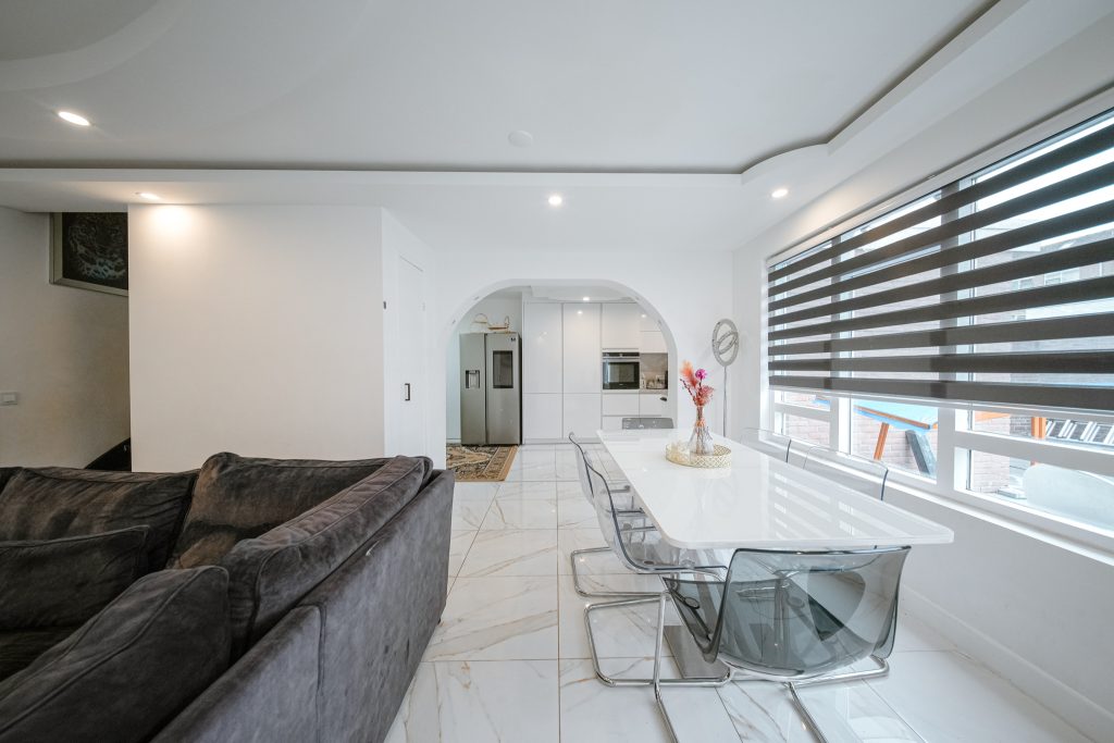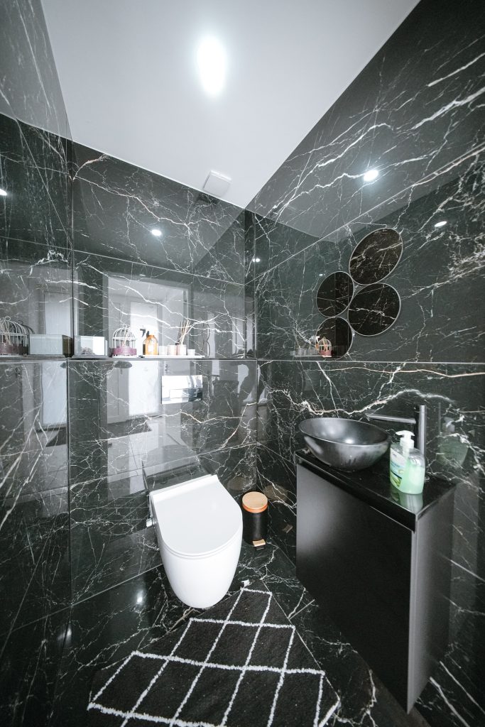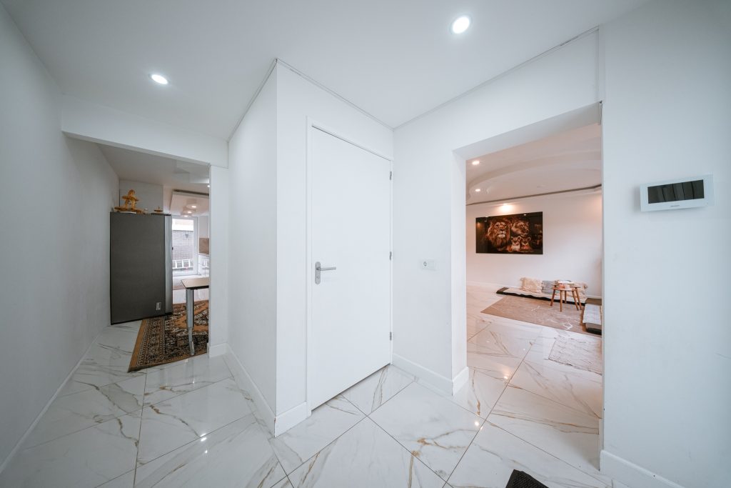 Bij binnenkomst valt direct de hoogwaardige afwerking op, met een strakke marmerlook keramische vloer met vloerverwarming, modern stucwerk en een indrukwekkend plafond met speelse ronde vormen en inbouwspots die zorgen voor een sfeervolle verlichting. Via de hal is er een directe toegang tot de keuken die 2 jaar geleden geplaatst is en de woonkamer, tevens is hier het toilet. Deze is volledig betegeld en er is gekozen om de luxe van de woning ook hierin zichtbaar terug te laten komen door de zwart-wit accenten en marmerlook keramische tegels.