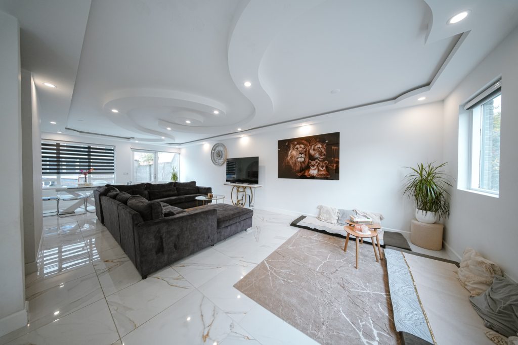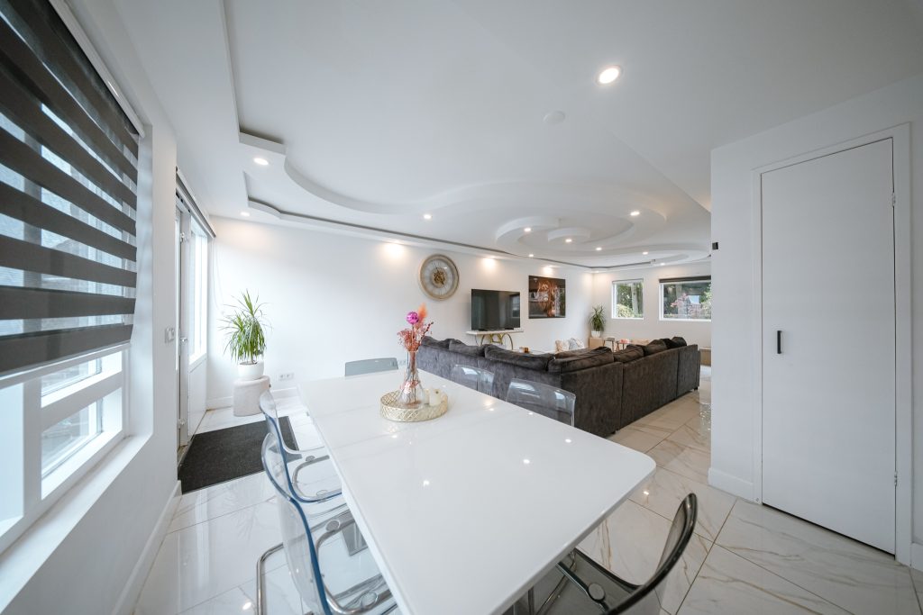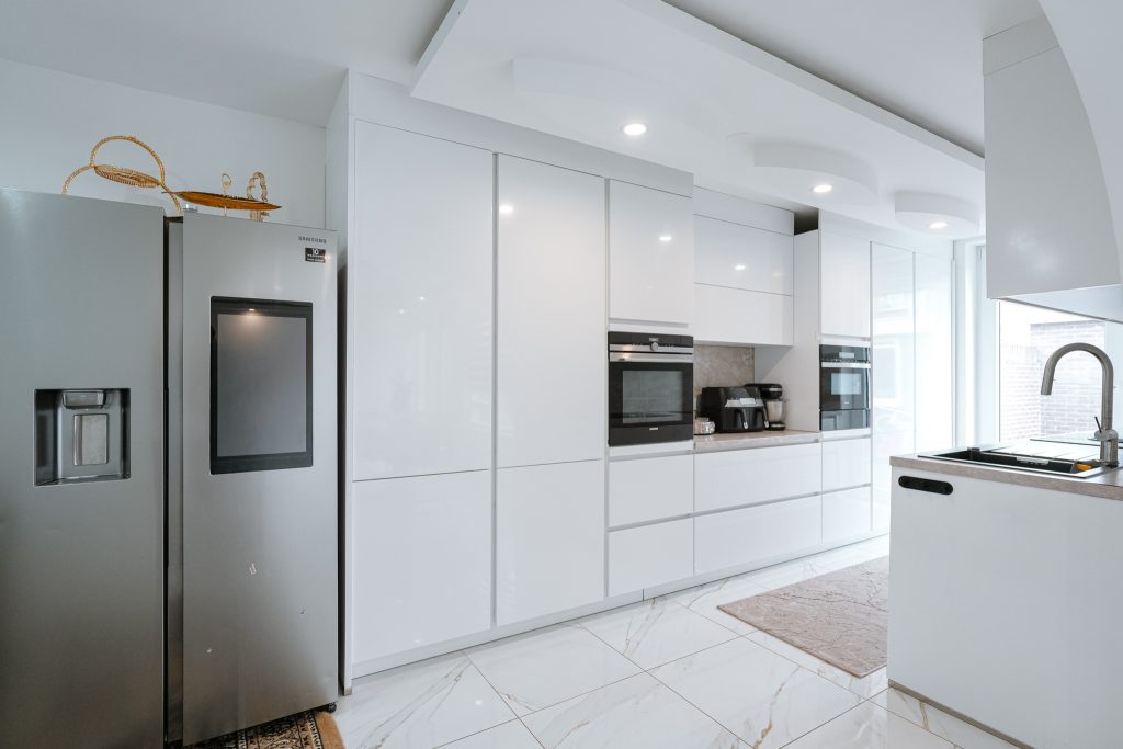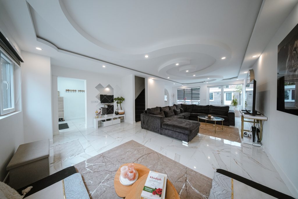 De royale woonkamer is het hart van de woning en biedt volop ruimte voor het hele gezin. De grote hoekbank benadrukt de ruimte en nodigt uit tot ontspannen avonden thuis. De open indeling zorgt voor een naadloze overgang naar de moderne keuken waar het plafond wederom indrukwekkend afgewerkt is. Onder de trap is een inbouwkast gerealiseerd dat zorgt voor extra opbergruimte. Dit alles benadrukt dat aan ieder detail is gedacht.