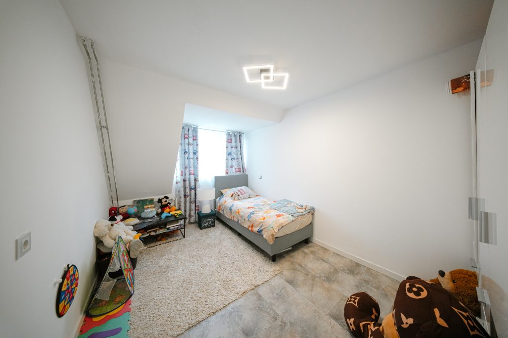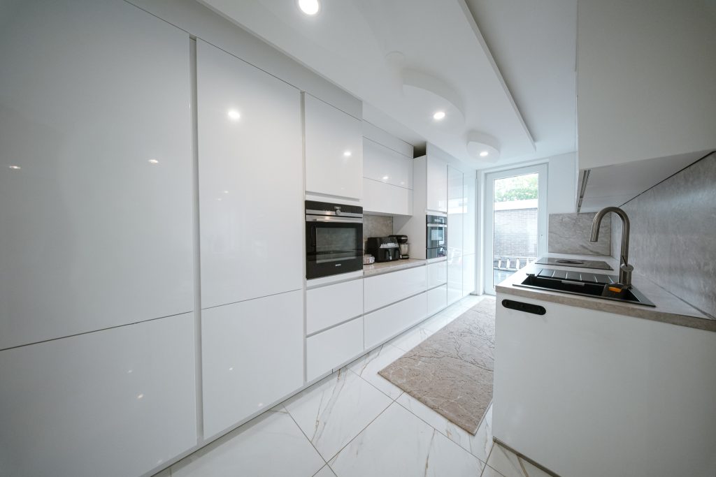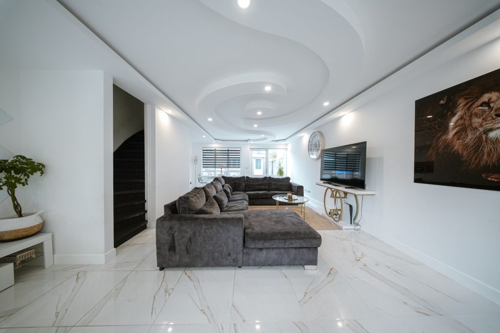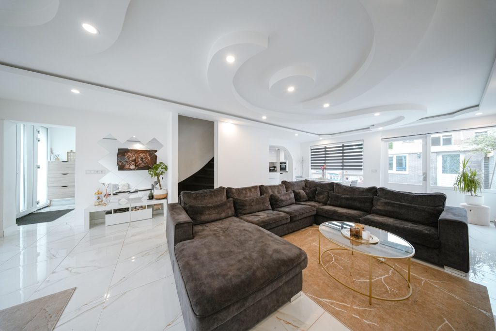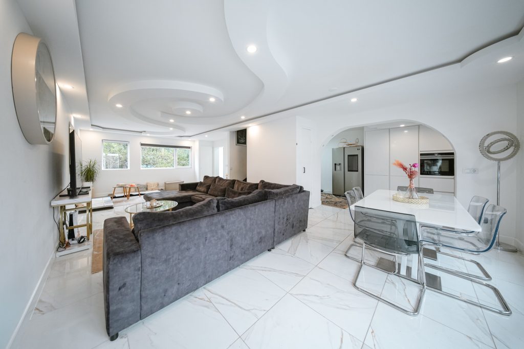De royale woonkamer is het hart van de woning en biedt volop ruimte voor het hele gezin. De grote hoekbank benadrukt de ruimte en nodigt uit tot ontspannen avonden thuis. De open indeling zorgt voor een naadloze overgang naar de moderne keuken waar het plafond wederom indrukwekkend afgewerkt is. Onder de trap is een inbouwkast gerealiseerd dat zorgt voor extra opbergruimte. Dit alles benadrukt dat aan ieder detail is gedacht.