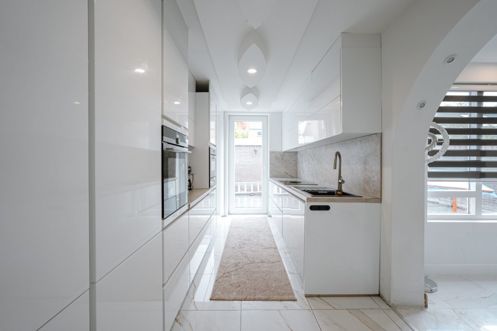 De moderne keuken is 2 jaar geleden geplaatst in het aangebouwde deel van de woning en beschikt over een moderne uitgebreide keukenuitrusting en is uitgevoerd in hoogglans wit. De keuken is voorzien van een oven, magnetron, koelkast, diepvries, inductiekookplaat met geïntegreerde afzuiging, vaatwasser en een rvs Quooker. Verder zorgen het neutrale kunststof werkblad, achterwand en de greeploze kasten voor een rustige en strakke uitstraling. De uitgebreide kastenwand zorgt voor veel opbergruimte. Door de ruime opstelling is er tevens ruimte om hier een werkplek te realiseren.