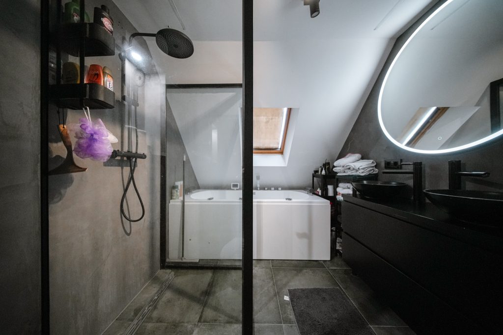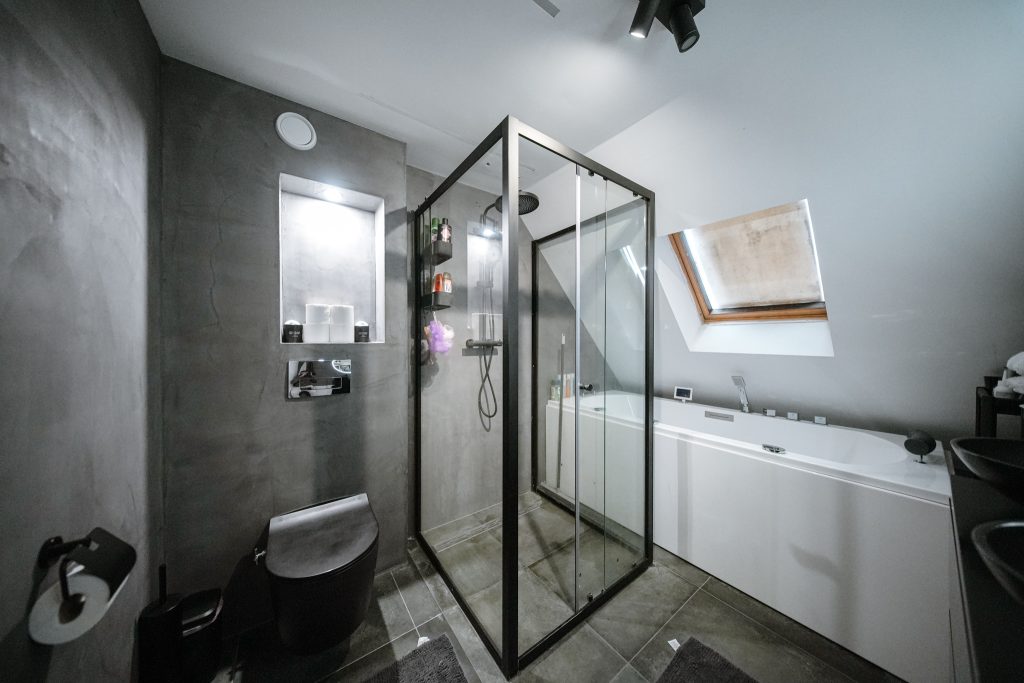 Ook de badkamer is wederom zeer luxe en strak afgewerkt met betonstuc wanden, een glazen inloopdouche, wc, ligbad, dubbele wasbak met meubel en ronde spiegel met geïntegreerde verlichting en verwarming. Ook hier is gekozen voor een zwart-wit look-and-feel. Er is een afzuiging en groot dakraam voor een goede ventilatie.